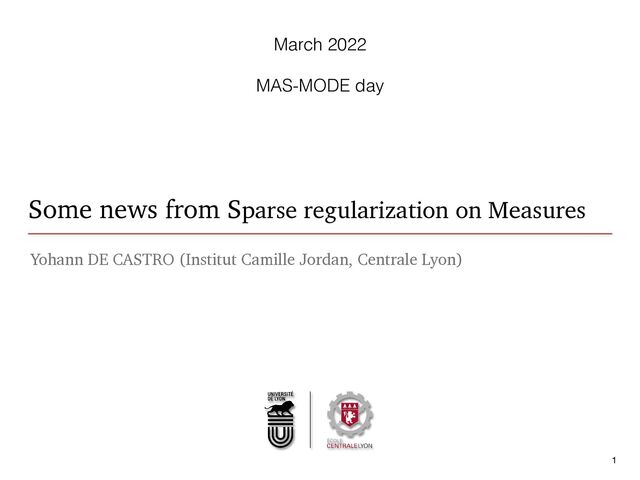 sha1_base64="gWT57j7NEYDBub1HllnLdJrZUsQ=">AAAMbXicnVb9T91UGD7M6caGbmhMlmhMI5hBciGwGGdITObYmIsuQxkwI9vS3nu4VHrbpqflY8gf6n+gP/kv+LzPe1rai6DxEtpz3vN+Pu/HaZQnsSuXln6fuPLO1Xffu3Z98sbNqfc/uHV7+sMtl1VF3272syQrXkahs0mc2s0yLhP7Mi9sOIoSux3tr8r59oEtXJylL8rj3L4ahcM03o37YQlSNn3VmR0TGWuGJjapOcGzxG6E91u8T80NnNe0AOfCvYvVqsnAH5s+1usmNAV4ZJeAMzBPsA/NABQLrhKUR1g5nOv+1KyAlpmcUrU1B1qI/11TgavPM7ES+OcsOGfxzmkvxM7Ss4KSs2bOHJk3Zt/0cCbveXLPQVMIv8SzgY8hpk/5mN8Ofs2DXpo9nAiHSIrliFEdglskS0YhvqrdHXgSUkqxWYP1FHbH6T+T3gPdIcIRdifw8huzDLuvsR7hrZ7vwFMLn0ruT3xcpz4i0ageHNKv2kuHkwqSxw1PAB2Kb+nx28EqIwIpfCrBqxhl5oBILoyhW/jcDIhMRN195sPhZEAZ0TVs2czA9ytWmsED0hSlymOS09fsfyAnOhQFrYnapqPffW9fZMT/kEgXTW3JM+7IHYK7ALaukXtIPXvkT1kxq9gJCuJR7wL64oWdssEcDBqU1ohuCpsLZhs2E3BZ3xGO+wPvr+IsuyNWa4H90OfGNQgcMs59yNW5GXksSmqULDrm2MLLIf575EvA6XxPRL5DzlCo8Zk1L8wWnguwJUiN2J+yamOoHiwwy45VW/hKlR7PaGsI/+ZhPYBGwU0zkoCe+b7ao/a4mQMa/4BnOgmEP/AYtKfLoDNd2h0sdXTcwbKAvG3qQOdNzFlWkp6yNyNy1mg4nuUex0e0k0Gv9XOlxwlXQb942ONMtDgvzJ+ditmAVAXdMf2Vjqp4orYcc2f/MXJ3SYV9T/mU3qiNDV9PD1nzmmOtloJxaEcoWmFnzu4SAdmlvBXCVg+fn8tRS38dY8hIJErHSs1Z/1r7jhMlZAxSDz1fobbVd0L7iXMs7mD3zE9rqbUKtbbGqK3XUnP9QI8czwqfGZEcsntS7i0rQzJ1MabPfXUX7Dyp4gr8Ifc6GfdAHfDOWGG+Vf8xPJOpmjdTSedg4Wu3K6tI1dPG0ddNZO8pZstZTI9BWQcmT9E57Vg1Twtjc0Kmq84KxVNnSXSuEobEx/r7YuR7YNRMtDrH3bkxB8+ew8t1Vm/tSRDcCe74b4KSmipWujN38SdZ+Rb+b0CmnfHHnHUxsRH6E86ByEdTd9KG16T12o7/O+bnLRGVTEouLc/Ofce8uT2ztLjEX3B+sewXM8b/1rPpifu8hTNgWDFrElmfNSC+/IJbe4nfL69grfsdoV9NFT3WSbzPCrSQqnwcer86Svf9hCwgGZgvWG8VKy1p5mBFzUK9SPeJvxcc8inzS3XV96j7V7ma87/KSSwleuVrxiA5z0mxnBGqpSIq+k14FlXJGtXeGjD/2iO2wTnw32P6bVP42+yP1k3eb6Z9hRl7WXTSZ7u+Mi/LjEPNDccyc9TJzWUIjt9jMTG4WCIBT+YnfyqcqNDl8Xo8v9i6t7j81eKXP96bebDia/W6+cR8jr5cNvfNA/TEOiZIf/LZpJv8bfL05l9TH099OvWZsl6Z8DIfmc5v6u7fTcFJfQ==</latexit> • Conic Particle Gradient Descent: optimizes a function on m parame- ters (xk, ak ) (called particles) that can be written as Fn (Yn, qm k=1 ak”xk ) then we can study the limit m æ Œ (over-parametrized) by considering the objective µ ‘æ Fn (Yn, µ) on the space of measures as in the works of Bach and Chizat, and Chizat. • Sliding Frank-Wolfe: solves convex programs on weakly compact sets (e.g., closed balls of the TV -norm for the weak-ı topology). This algorithm is a conditional gradient descent that may converge in a finite number of steps (Denoyelle, Duval, Peyr´ e, and Soubies) under some conditions. • Kernel SoS: Based on representation of nonnegative function based and a subsampling strategy, see Bach, Rudi, and Marteau-Ferey, and Lasserre, Magron, et al. • Other popular methods: Prony-type spectral methods such as MUSIC and ESPRIT, and non-convex approaches based on greedy minimization (e.g., (COMP) and “Continuous” LARS), see Elvira, Gribonval, Soussen, and Herzet.