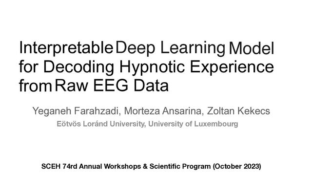 G., McGeown, W. J., Santarcangelo, E. L., ... & Terhune, D. B. (2017). New directions in hypnosis research: strategies for advancing the cognitive and clinical neuroscience of hypnosis. Neuroscience of consciousness, 2017(1), nix004. Kihlstrom, J. F. (2013). Neuro-hypnotism: Prospects for hypnosis and neuroscience. Cortex, 49(2), 365-374. Goodfellow, I. (2016). Deep Learning-Ian Goodfellow, Yoshua Bengio, Aaron Courville. Adapt. Comput. Mach. Learn. Chollet, F. (2021). Deep learning with Python. Roy, Y., Banville, H., Albuquerque, I., Gramfort, A., Falk, T. H., & Faubert, J. (2019). Deep learning-based electroencephalography analysis: a systematic review. Journal of neural engineering, 16(5), 051001. Thomas, A. W., Ré, C., & Poldrack, R. A. (2023). Benchmarking explanation methods for mental state decoding with deep learning models. NeuroImage, 273, 120109. Farahzadi, Y., Alldredge, C., & Kekecs, Z. (2023). Neural Correlates of Hypnosis: Insights from EEG-Based Machine Learning Models.
