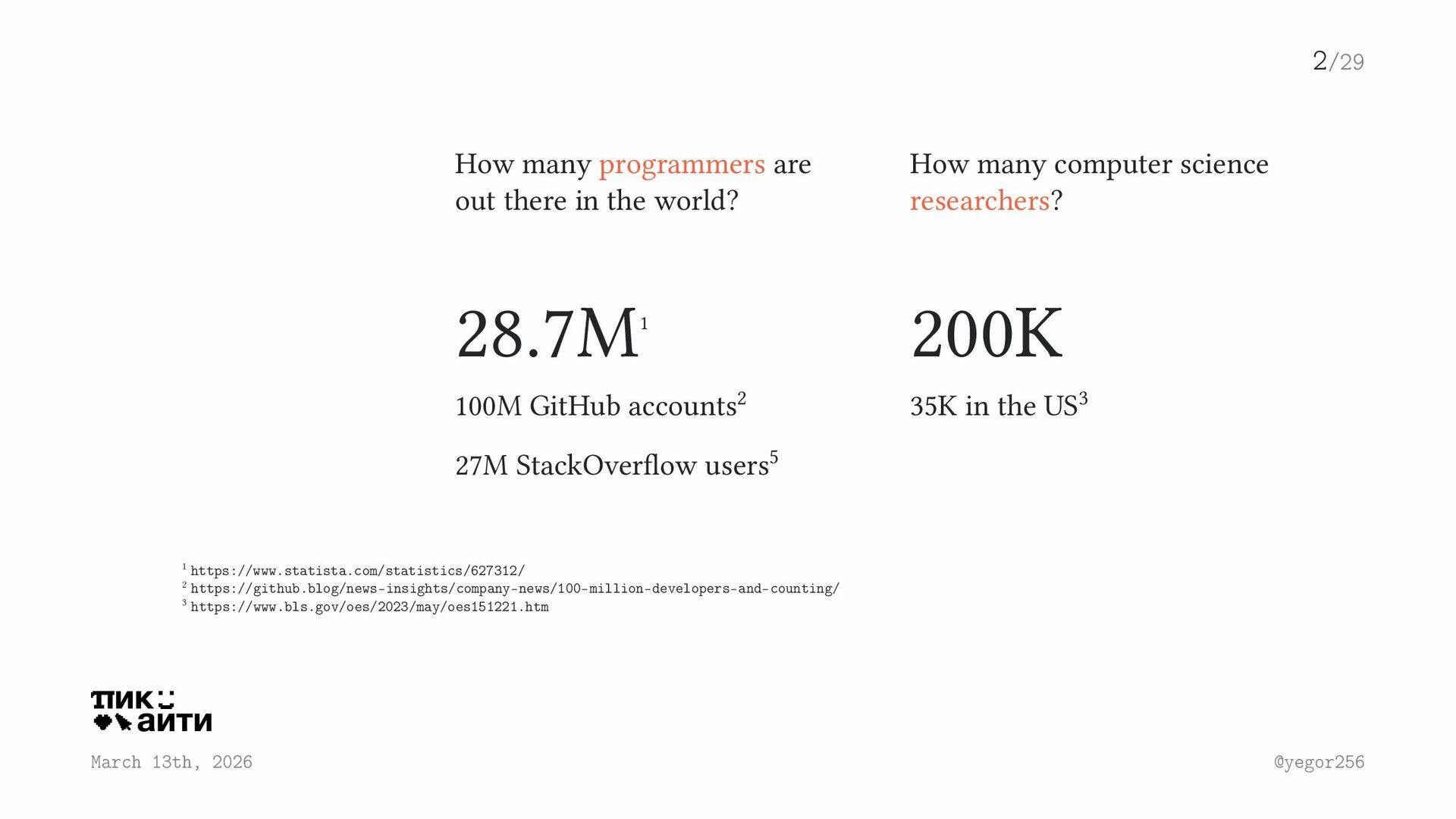 out there in the world? 28.7M1 100M GitHub accounts2 27M StackOverflow users5 How many computer science researchers? 200K 35K in the US3 2/29 March 13th, 2026 @yegor256