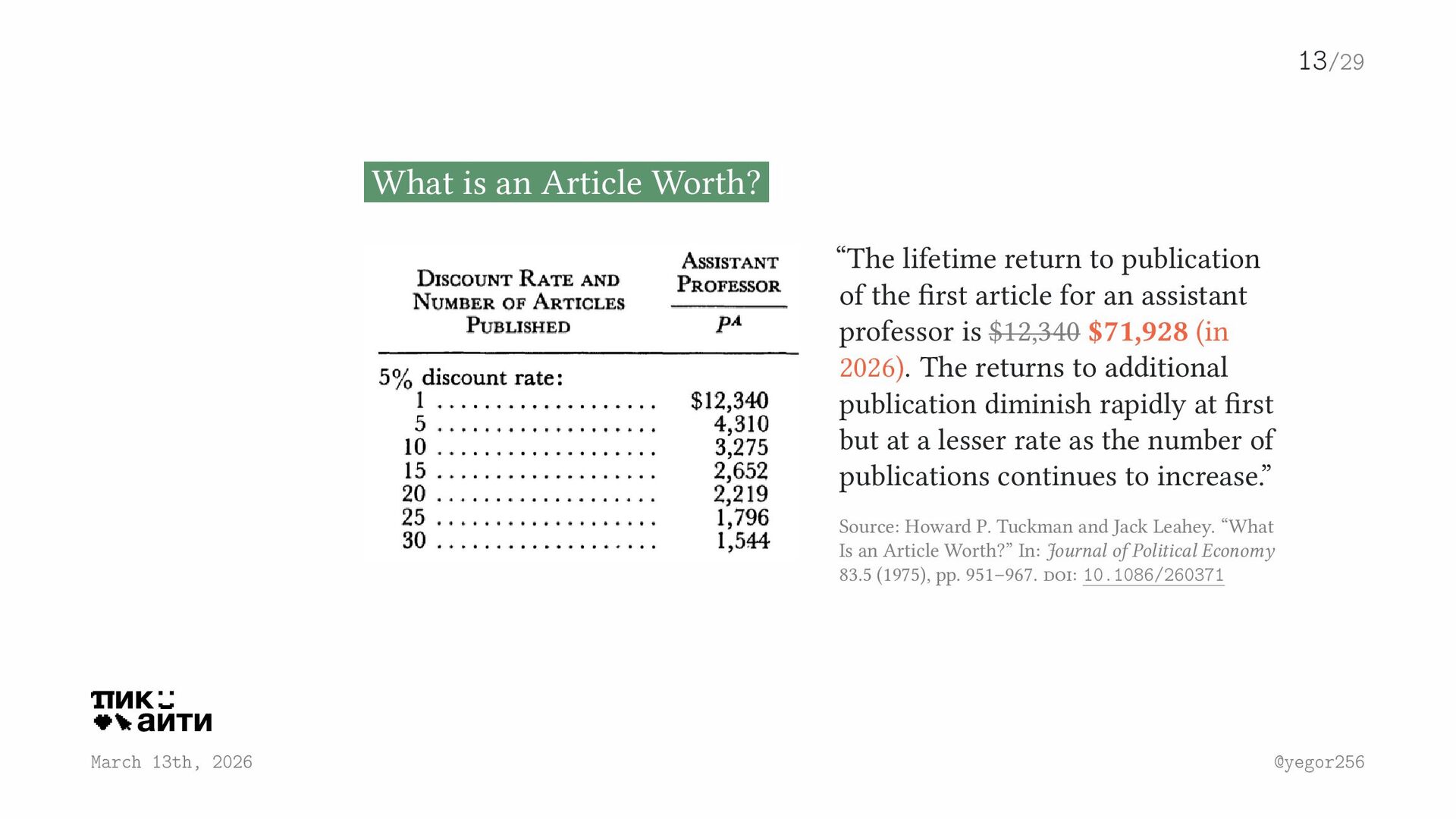 “The lifetime return to publication of the first article for an assistant professor is $12,340 $71,928 (in 2026). The returns to additional publication diminish rapidly at first but at a lesser rate as the number of publications continues to increase.” Source: Howard P. Tuckman and Jack Leahey. “What Is an Article Worth?” In: Journal of Political Economy 83.5 (1975), pp. 951–967. doi: 10.1086/260371