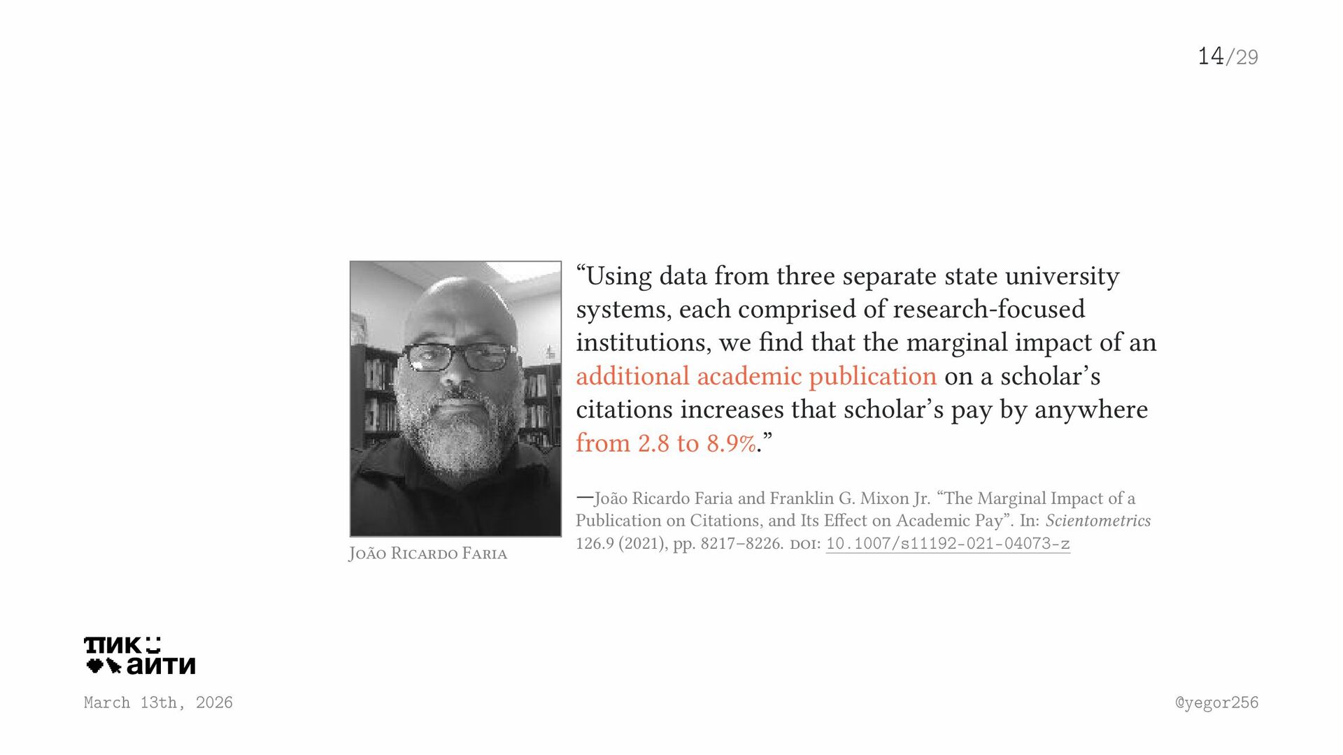 from three separate state university systems, each comprised of research-focused institutions, we find that the marginal impact of an additional academic publication on a scholar’s citations increases that scholar’s pay by anywhere from 2.8 to 8.9%.” —João Ricardo Faria and Franklin G. Mixon Jr. “The Marginal Impact of a Publication on Citations, and Its Effect on Academic Pay”. In: Scientometrics 126.9 (2021), pp. 8217–8226. doi: 10.1007/s11192-021-04073-z