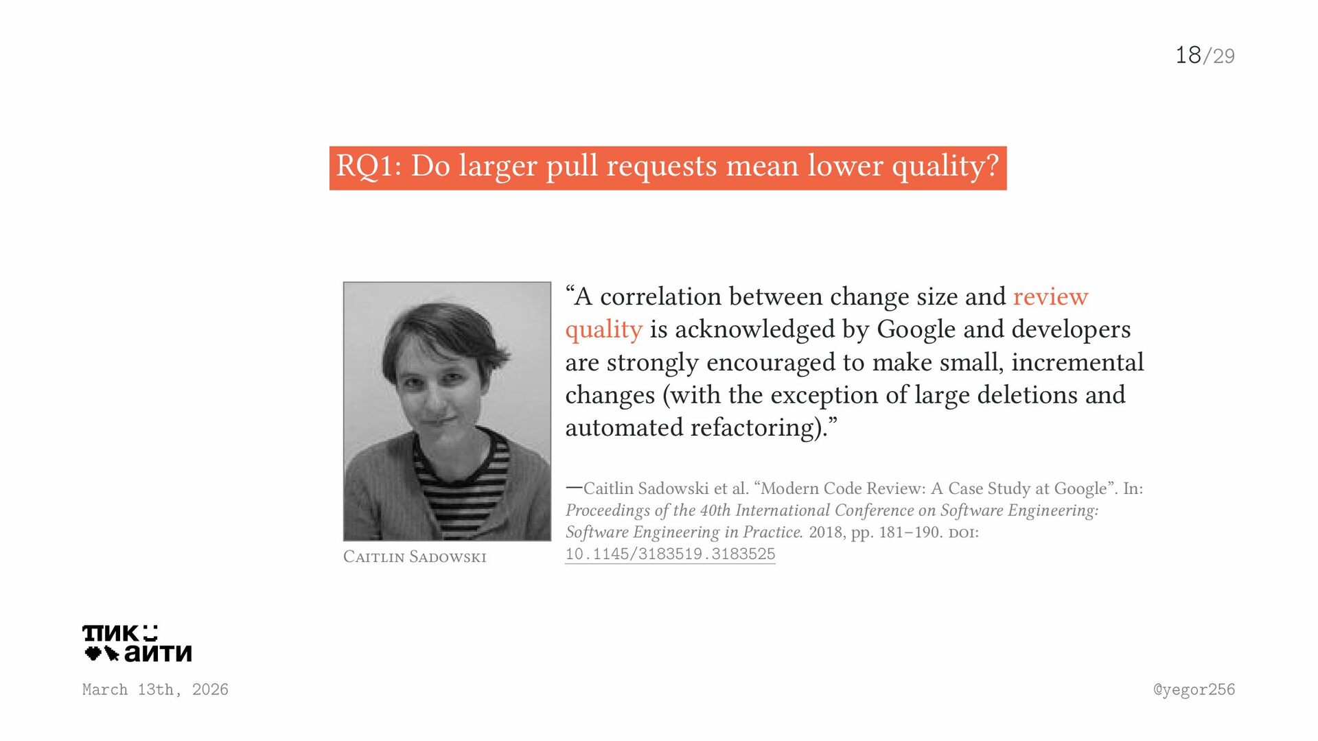 mean lower quality? Caitlin Sadowski “A correlation between change size and review quality is acknowledged by Google and developers are strongly encouraged to make small, incremental changes (with the exception of large deletions and automated refactoring).” —Caitlin Sadowski et al. “Modern Code Review: A Case Study at Google”. In: Proceedings of the 40th International Conference on Software Engineering: Software Engineering in Practice. 2018, pp. 181–190. doi: 10.1145/3183519.3183525