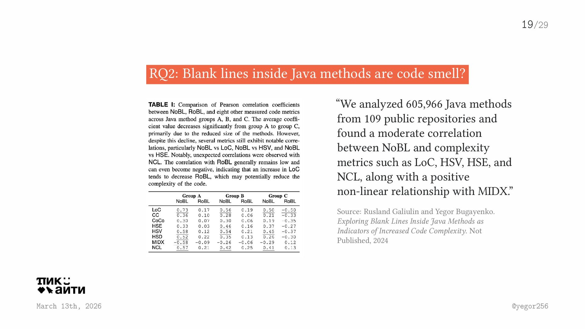 methods are code smell? “We analyzed 605,966 Java methods from 109 public repositories and found a moderate correlation between NoBL and complexity metrics such as LoC, HSV, HSE, and NCL, along with a positive non-linear relationship with MIDX.” Source: Rusland Galiulin and Yegor Bugayenko. Exploring Blank Lines Inside Java Methods as Indicators of Increased Code Complexity. Not Published, 2024