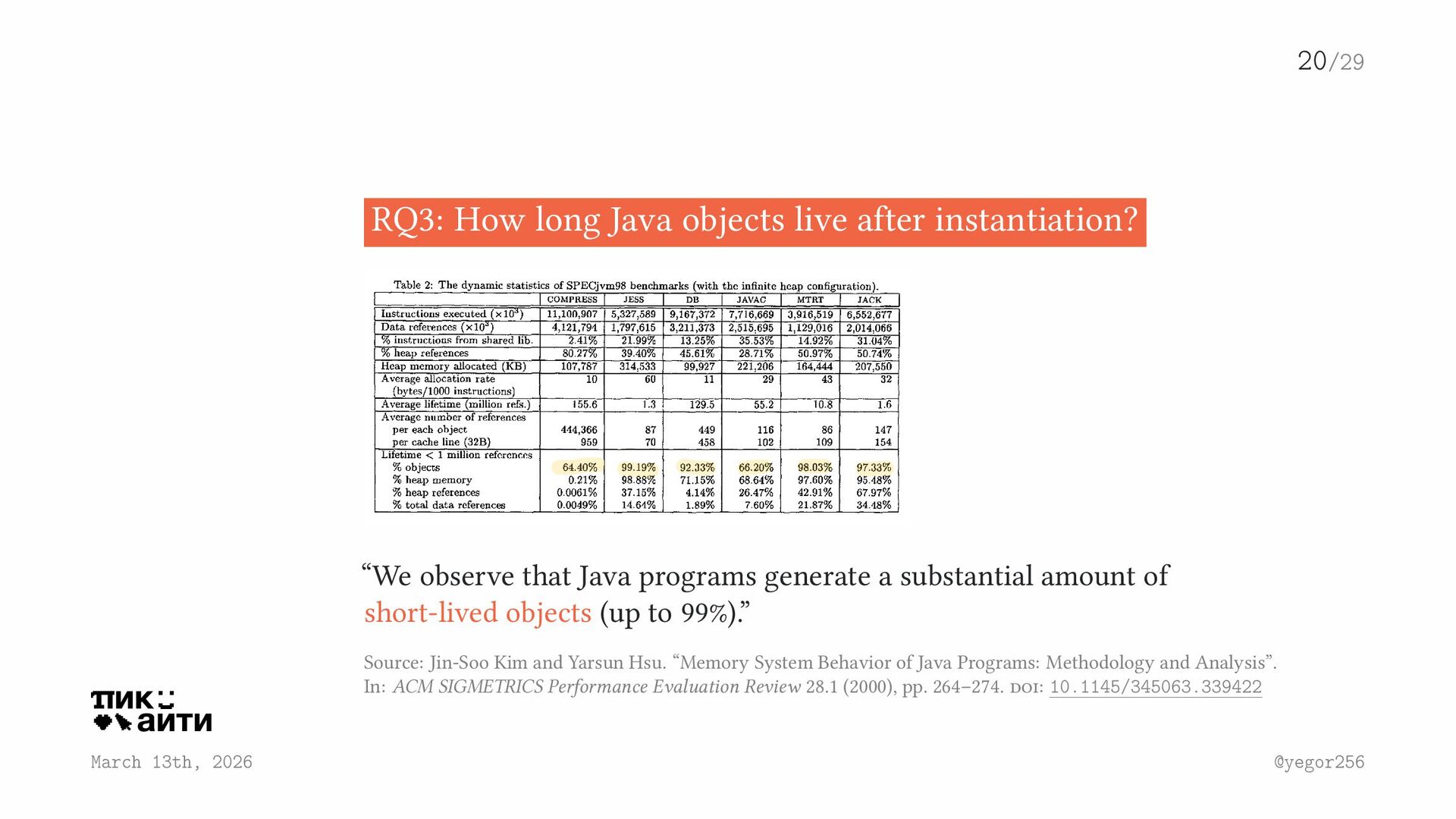 live after instantiation? “We observe that Java programs generate a substantial amount of short-lived objects (up to 99%).” Source: Jin-Soo Kim and Yarsun Hsu. “Memory System Behavior of Java Programs: Methodology and Analysis”. In: ACM SIGMETRICS Performance Evaluation Review 28.1 (2000), pp. 264–274. doi: 10.1145/345063.339422