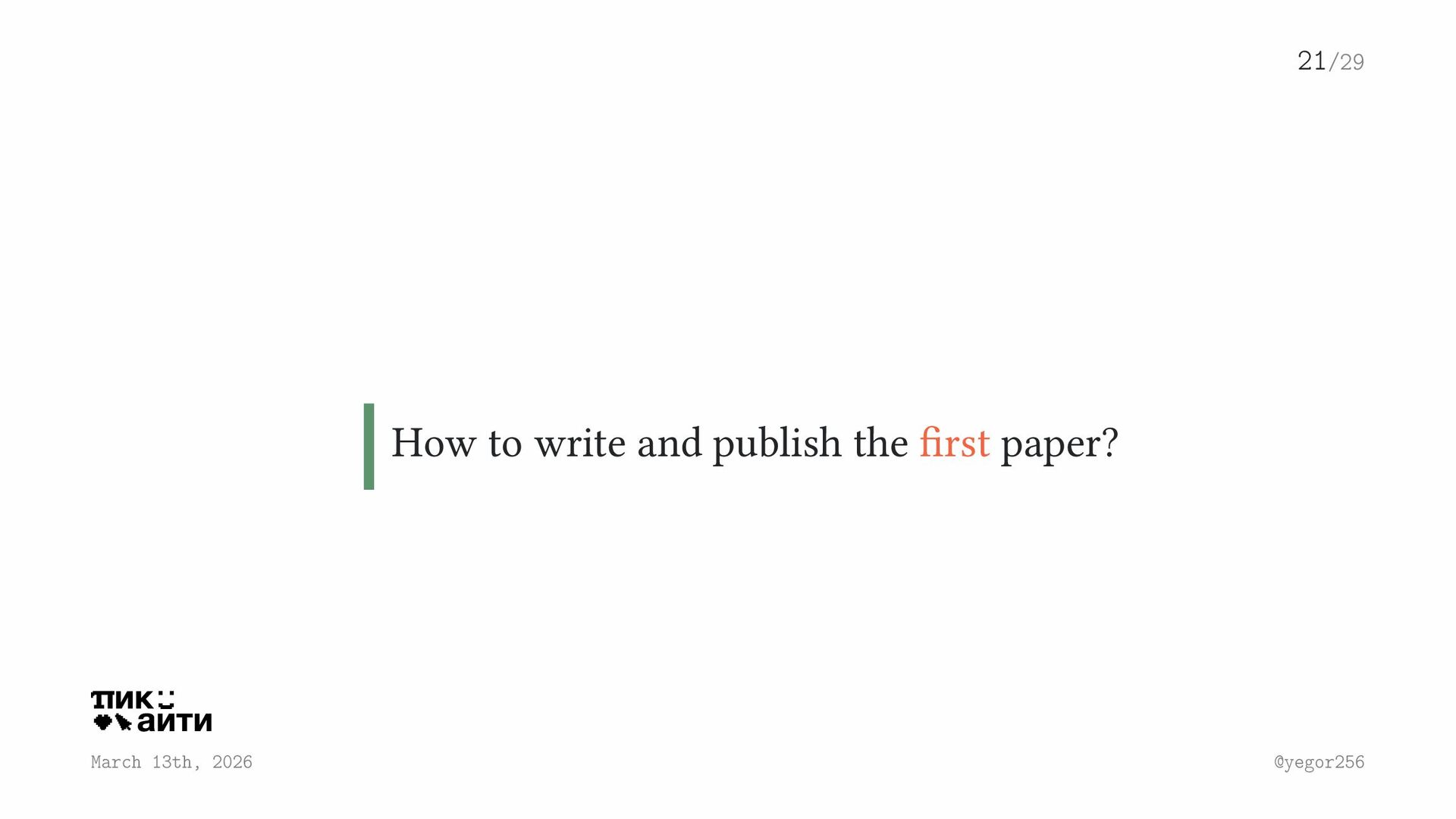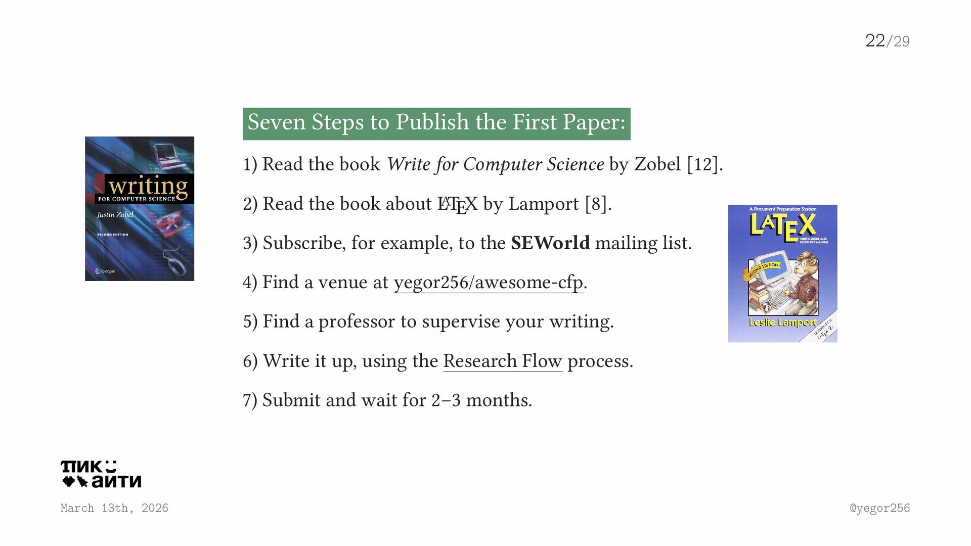 First Paper: 1) Read the book Write for Computer Science by Zobel [12]. 2) Read the book about L A TEX by Lamport [8]. 3) Subscribe, for example, to the SEWorld mailing list. 4) Find a venue at yegor256/awesome-cfp. 5) Find a professor to supervise your writing. 6) Write it up, using the Research Flow process. 7) Submit and wait for 2–3 months.