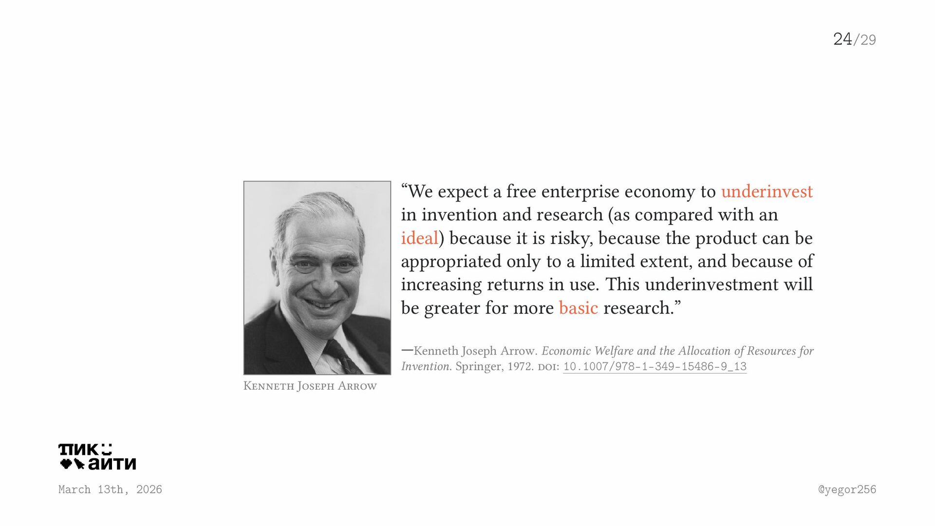 a free enterprise economy to underinvest in invention and research (as compared with an ideal) because it is risky, because the product can be appropriated only to a limited extent, and because of increasing returns in use. This underinvestment will be greater for more basic research.” —Kenneth Joseph Arrow. Economic Welfare and the Allocation of Resources for Invention. Springer, 1972. doi: 10.1007/978-1-349-15486-9_13