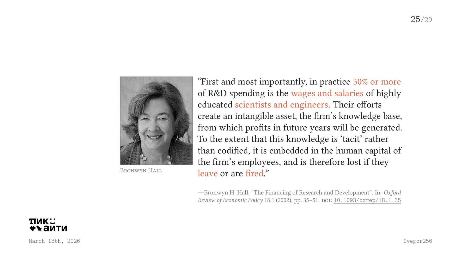 importantly, in practice 50% or more of R&D spending is the wages and salaries of highly educated scientists and engineers. Their efforts create an intangible asset, the firm’s knowledge base, from which profits in future years will be generated. To the extent that this knowledge is ‘tacit’ rather than codified, it is embedded in the human capital of the firm’s employees, and is therefore lost if they leave or are fired.” —Bronwyn H. Hall. “The Financing of Research and Development”. In: Oxford Review of Economic Policy 18.1 (2002), pp. 35–51. doi: 10.1093/oxrep/18.1.35