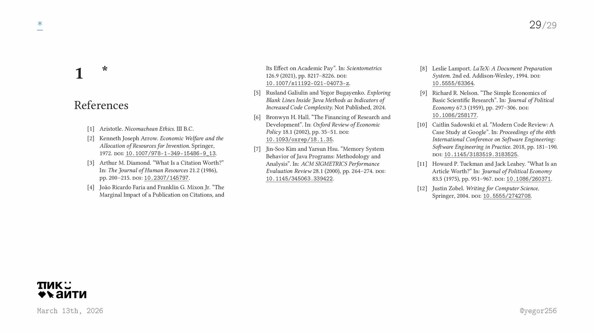 Aristotle. Nicomachean Ethics. III B.C. [2] Kenneth Joseph Arrow. Economic Welfare and the Allocation of Resources for Invention. Springer, 1972. doi: 10.1007/978-1-349-15486-9_13. [3] Arthur M. Diamond. “What Is a Citation Worth?” In: The Journal of Human Resources 21.2 (1986), pp. 200–215. doi: 10.2307/145797. [4] João Ricardo Faria and Franklin G. Mixon Jr. “The Marginal Impact of a Publication on Citations, and Its Effect on Academic Pay”. In: Scientometrics 126.9 (2021), pp. 8217–8226. doi: 10.1007/s11192-021-04073-z. [5] Rusland Galiulin and Yegor Bugayenko. Exploring Blank Lines Inside Java Methods as Indicators of Increased Code Complexity. Not Published, 2024. [6] Bronwyn H. Hall. “The Financing of Research and Development”. In: Oxford Review of Economic Policy 18.1 (2002), pp. 35–51. doi: 10.1093/oxrep/18.1.35. [7] Jin-Soo Kim and Yarsun Hsu. “Memory System Behavior of Java Programs: Methodology and Analysis”. In: ACM SIGMETRICS Performance Evaluation Review 28.1 (2000), pp. 264–274. doi: 10.1145/345063.339422. [8] Leslie Lamport. LaTeX: A Document Preparation System. 2nd ed. Addison-Wesley, 1994. doi: 10.5555/63364. [9] Richard R. Nelson. “The Simple Economics of Basic Scientific Research”. In: Journal of Political Economy 67.3 (1959), pp. 297–306. doi: 10.1086/258177. [10] Caitlin Sadowski et al. “Modern Code Review: A Case Study at Google”. In: Proceedings of the 40th International Conference on Software Engineering: Software Engineering in Practice. 2018, pp. 181–190. doi: 10.1145/3183519.3183525. [11] Howard P. Tuckman and Jack Leahey. “What Is an Article Worth?” In: Journal of Political Economy 83.5 (1975), pp. 951–967. doi: 10.1086/260371. [12] Justin Zobel. Writing for Computer Science. Springer, 2004. doi: 10.5555/2742708.