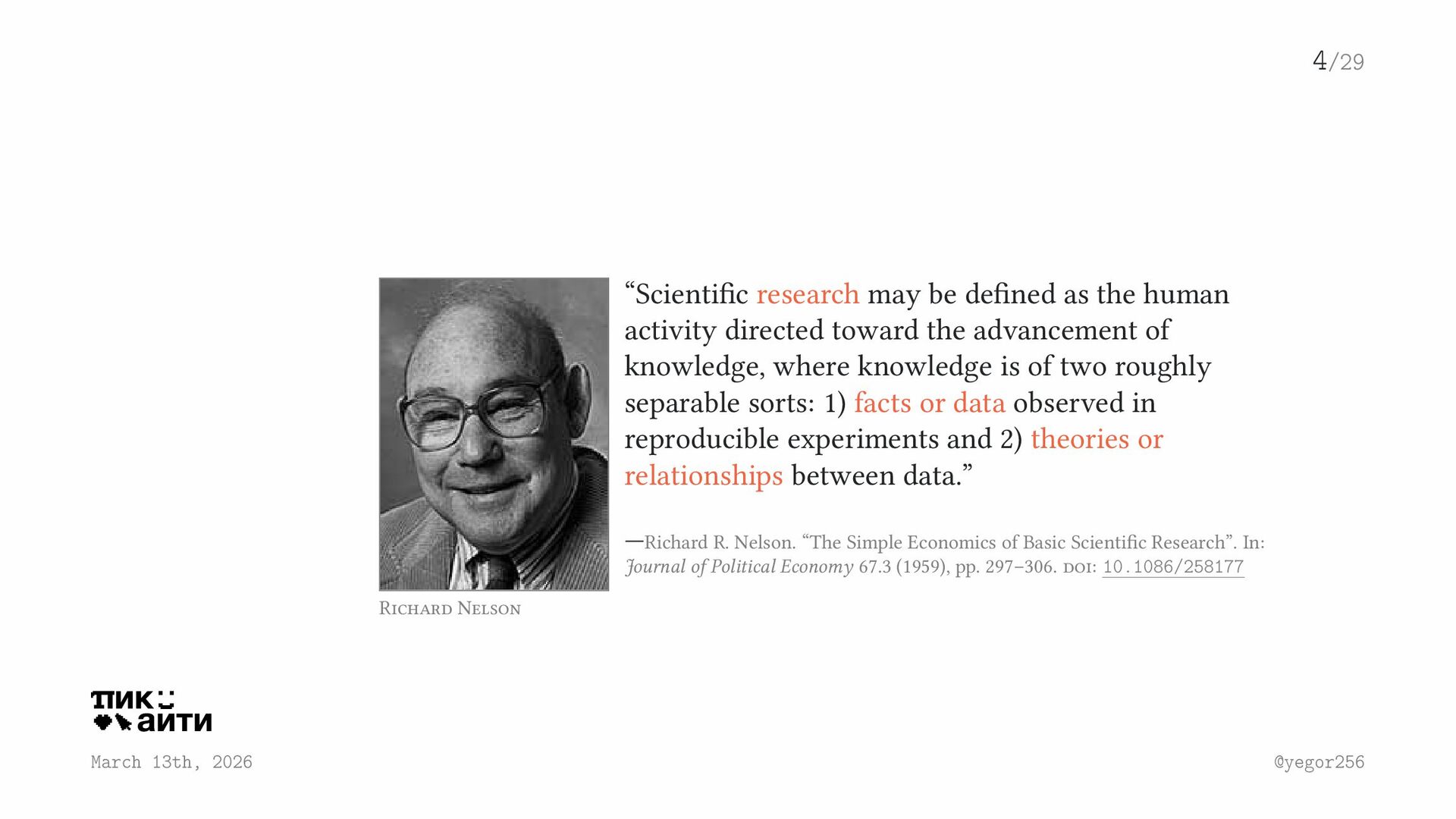 be defined as the human activity directed toward the advancement of knowledge, where knowledge is of two roughly separable sorts: 1) facts or data observed in reproducible experiments and 2) theories or relationships between data.” —Richard R. Nelson. “The Simple Economics of Basic Scientific Research”. In: Journal of Political Economy 67.3 (1959), pp. 297–306. doi: 10.1086/258177