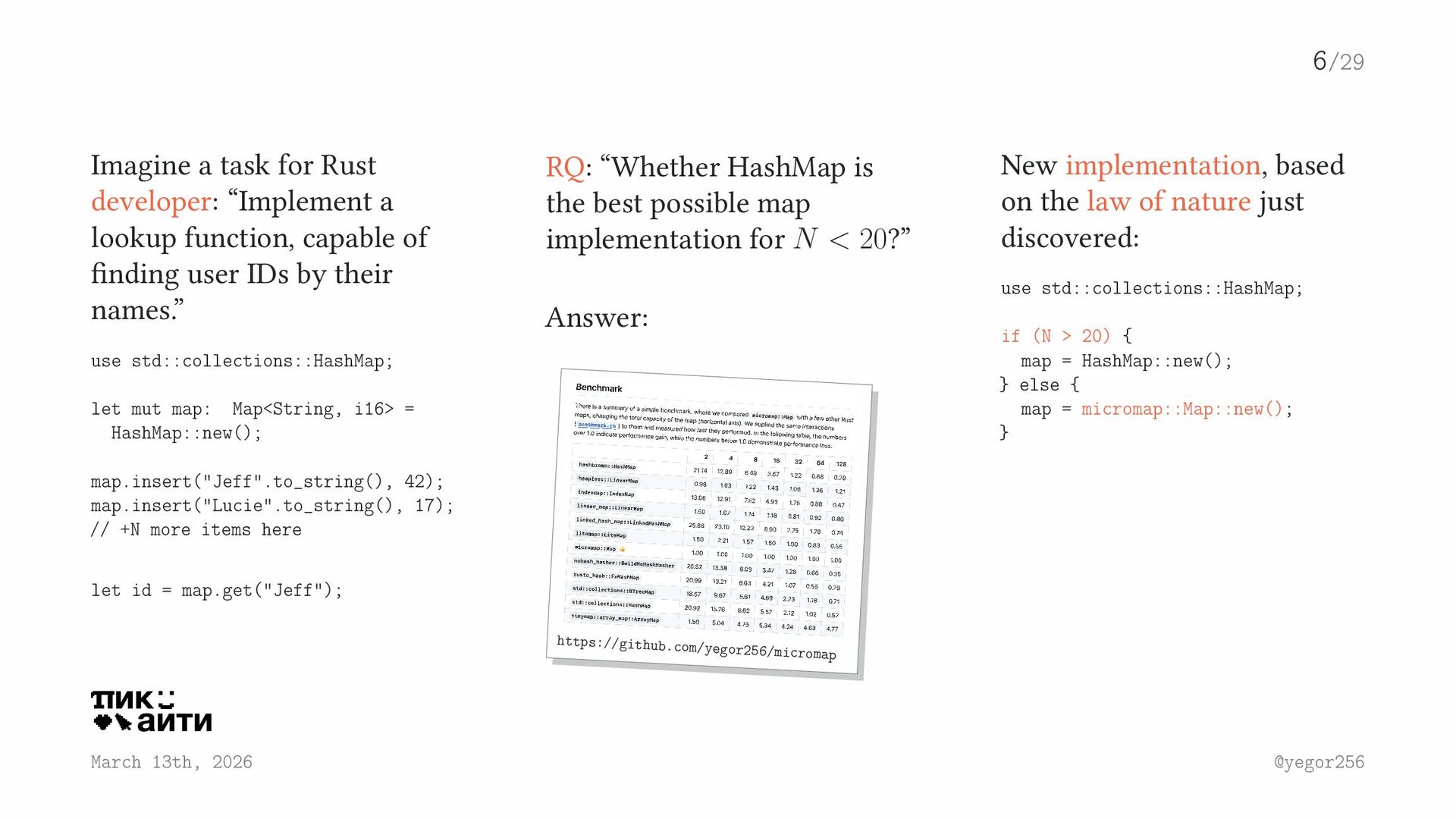 capable of finding user IDs by their names.” use std::collections::HashMap; let mut map: Map<String, i16> = HashMap::new(); map.insert("Jeff".to_string(), 42); map.insert("Lucie".to_string(), 17); // +N more items here let id = map.get("Jeff"); RQ: “Whether HashMap is the best possible map implementation for N < 20?” Answer: https://github.com/yegor256/micromap New implementation, based on the law of nature just discovered: use std::collections::HashMap; if (N > 20) { map = HashMap::new(); } else { map = micromap::Map::new(); } 6/29 March 13th, 2026 @yegor256