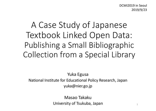 dataset of bibliographic information of textbooks • The dataset was compiled from bibliographic data organized by a special library, the Library of Education at National Institute for Educational Policy Research, Japan. • 7,548 Japanese textbook volumes from 1992 to 2017 • 219,018 Resource Description Framework (RDF) triples as of April 2019 • Related resources of textbooks are also included: • Curriculum guidelines, subject area, and subject 2