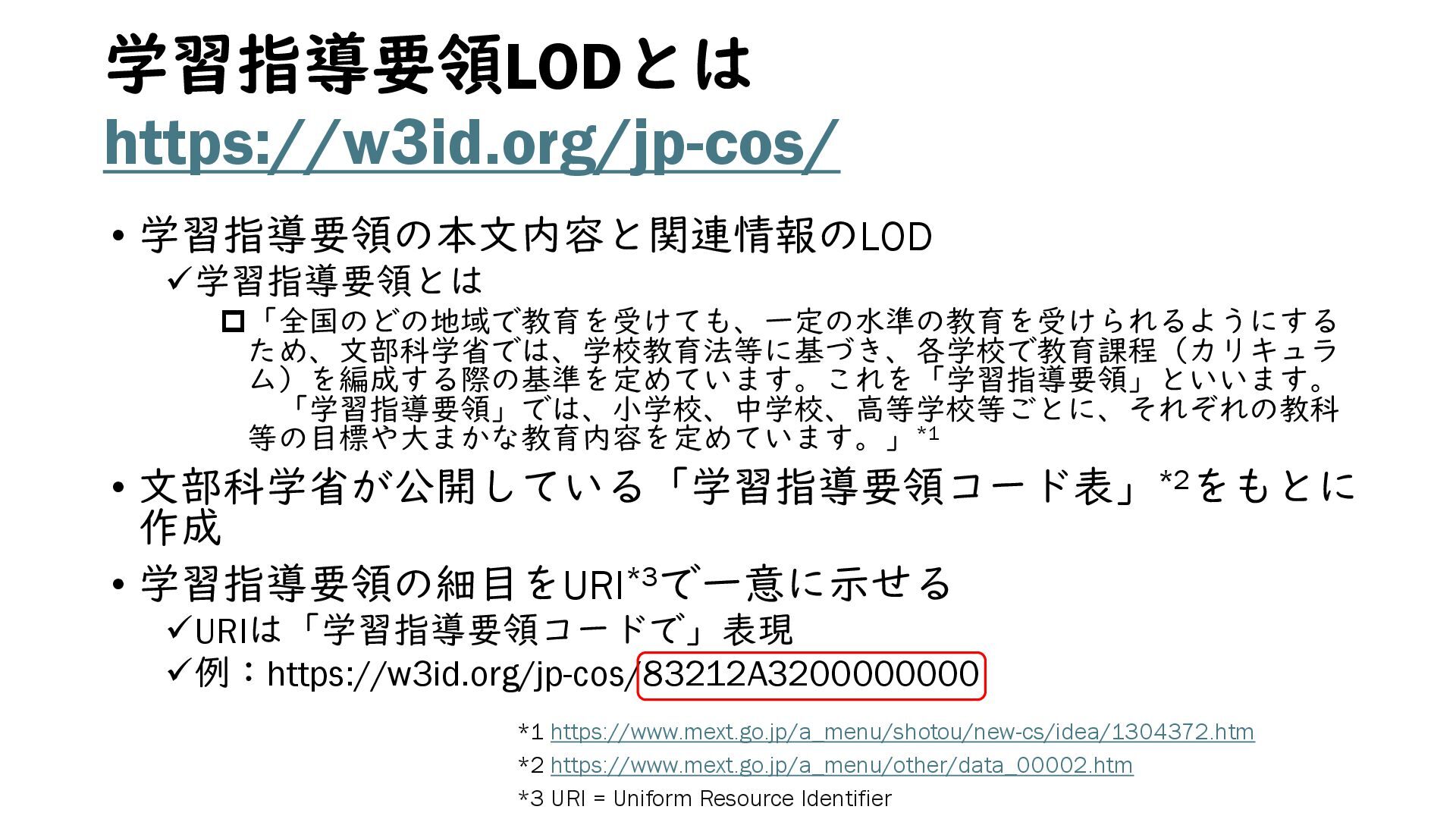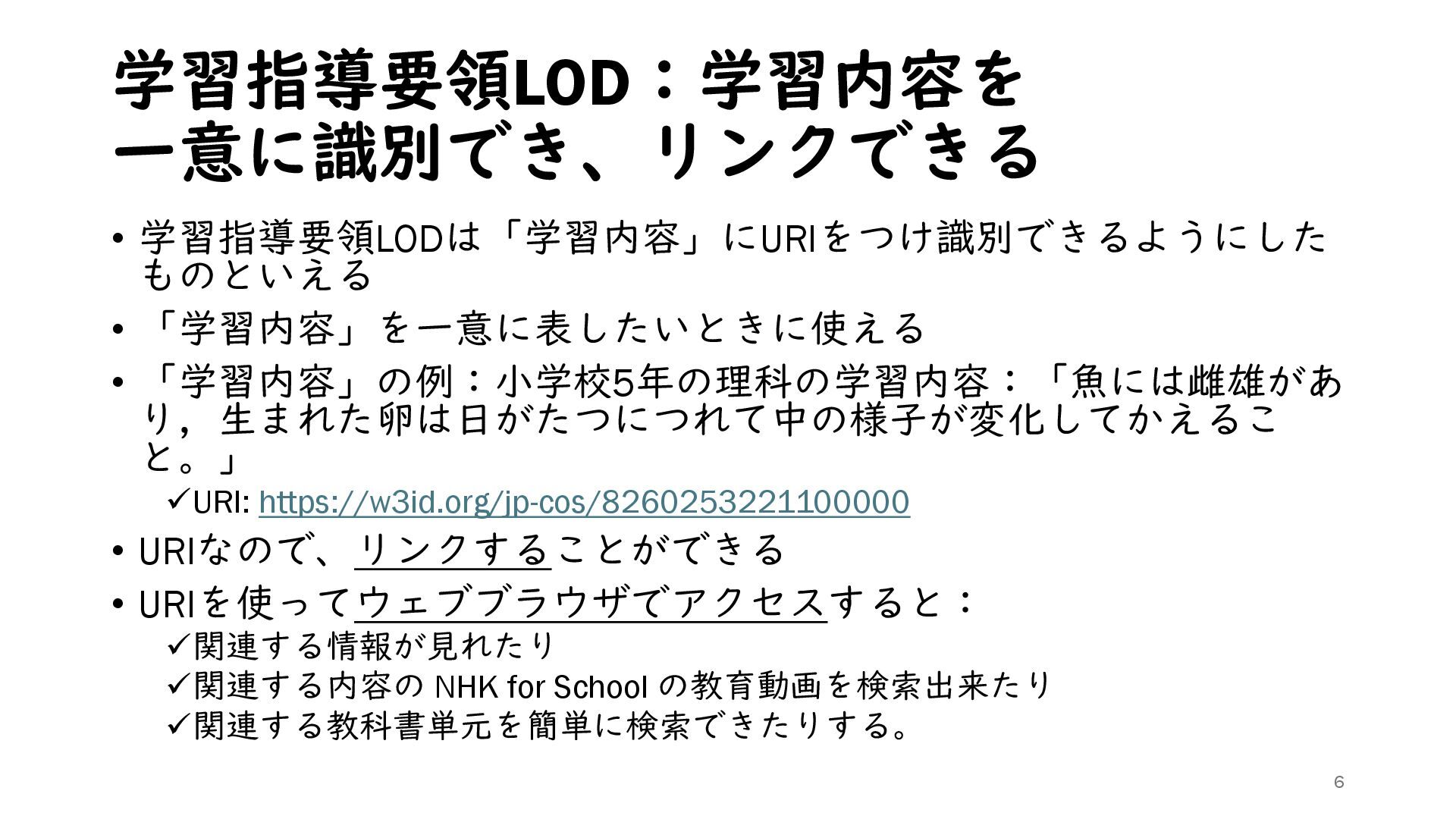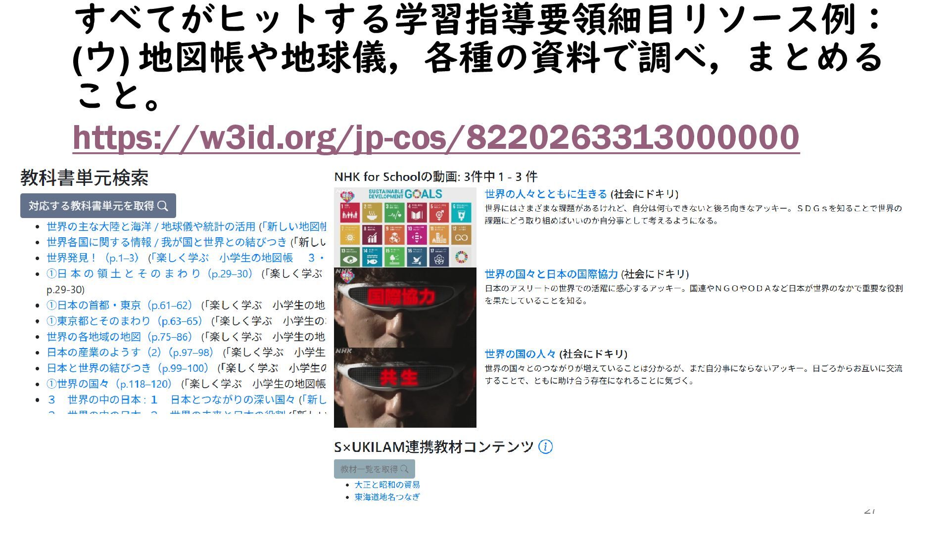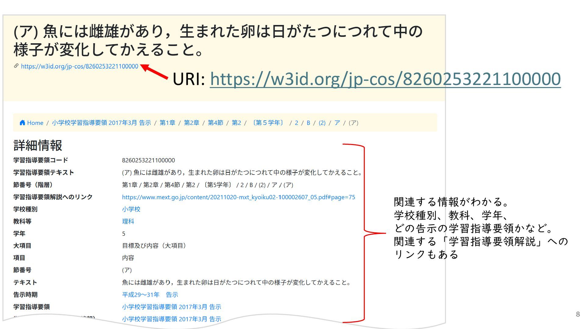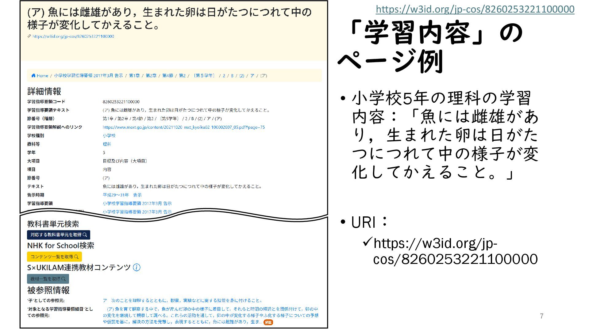 と。」 ✓URI: https://w3id.org/jp-cos/8260253221100000 • URIなので、リンクすることができる • URIを使ってウェブブラウザでアクセスすると: ✓関連する情報が見れたり ✓関連する内容の NHK for School の教育動画を検索出来たり ✓関連する教科書単元を簡単に検索できたりする。 6