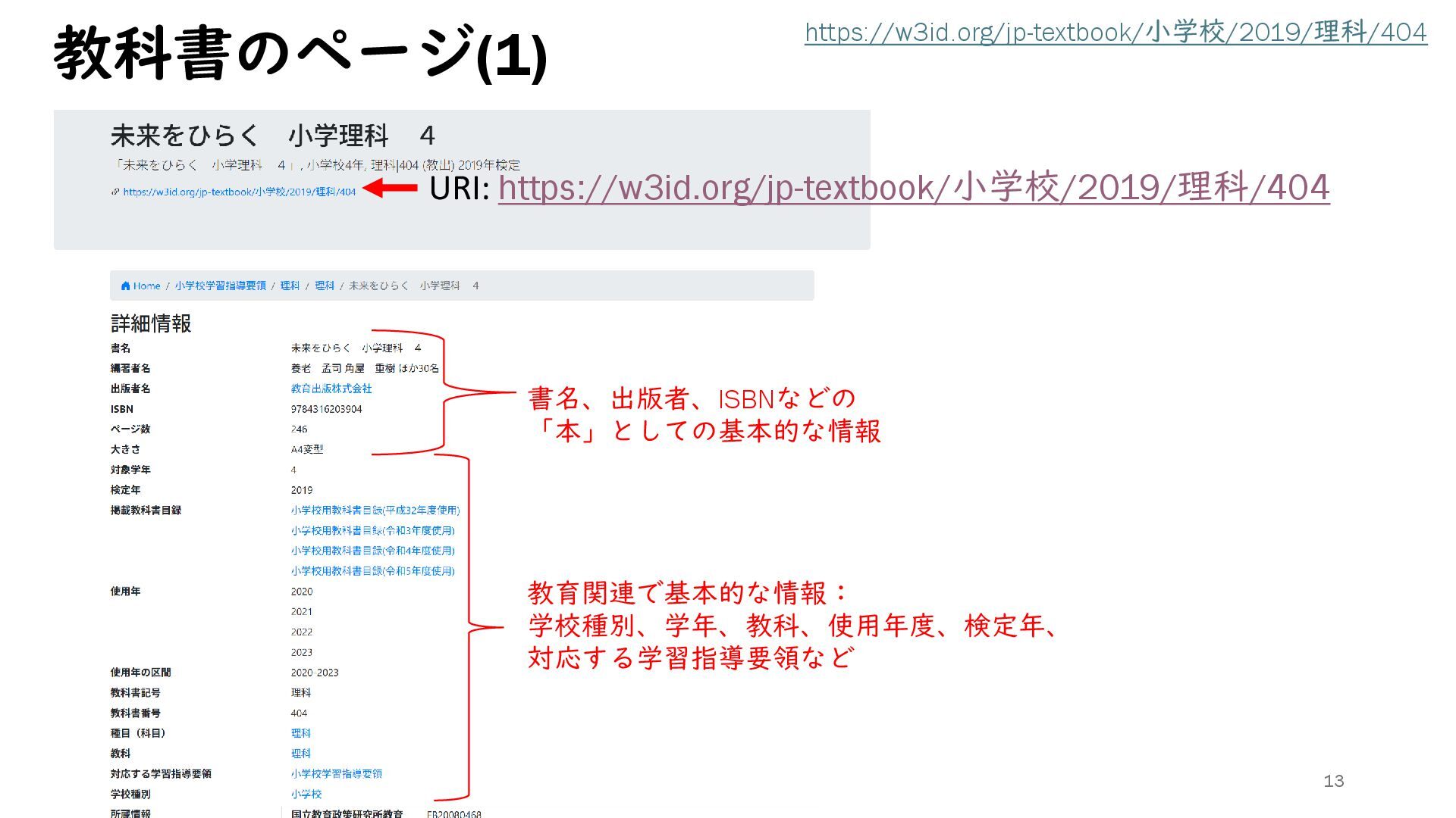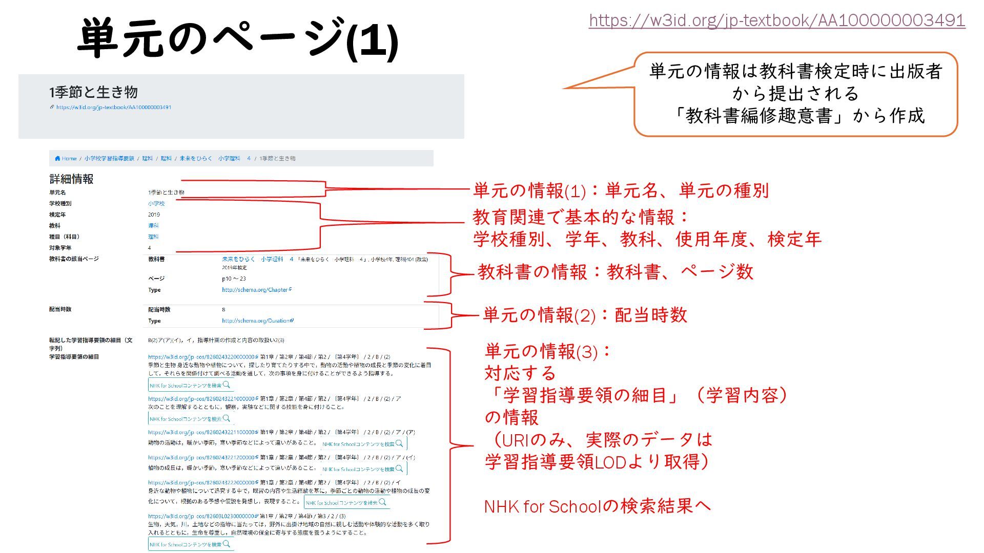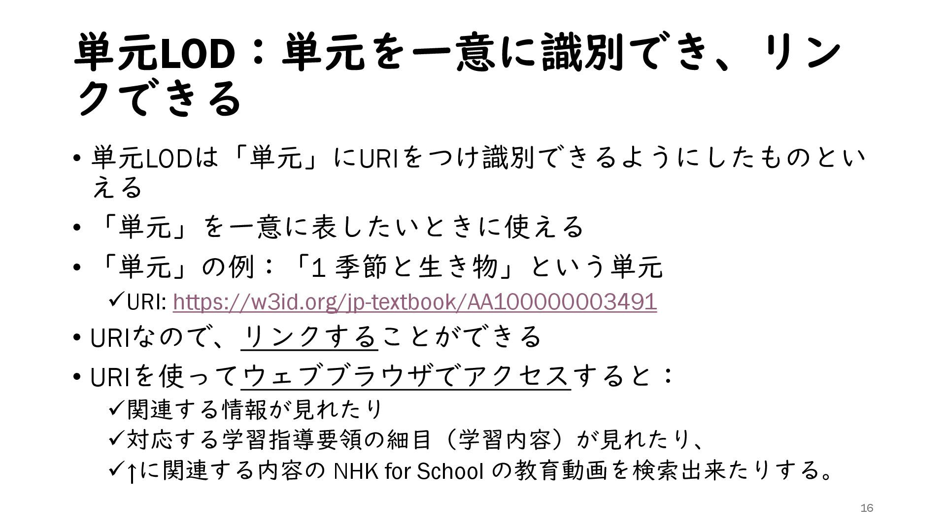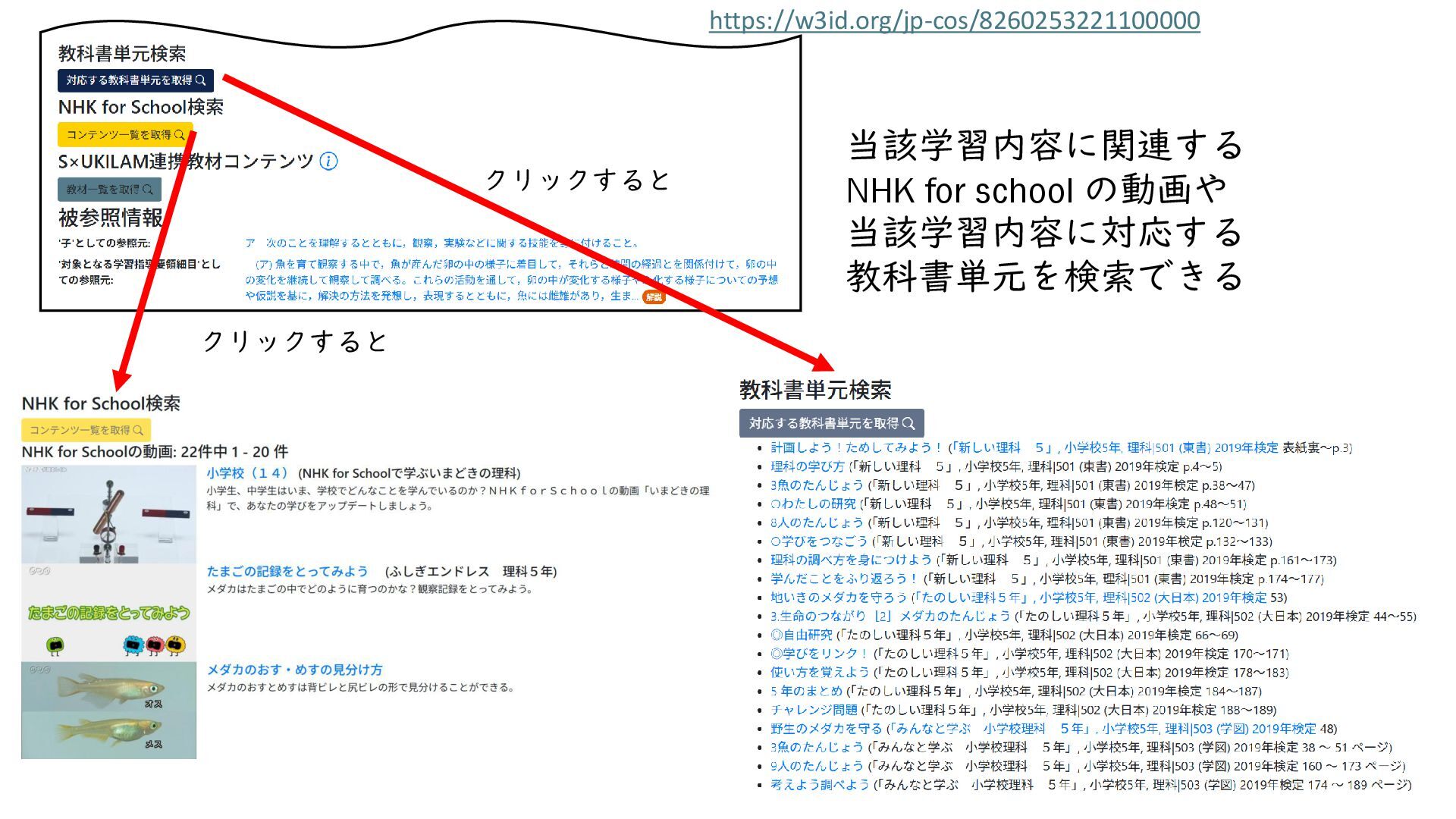 と。」 ✓URI: https://w3id.org/jp-cos/8260253221100000 • URIなので、リンクすることができる • URIを使ってウェブブラウザでアクセスすると: ✓関連する情報が見れたり ✓関連する内容の NHK for School の教育動画を検索出来たり ✓関連する教科書単元を簡単に検索できたりする。 6