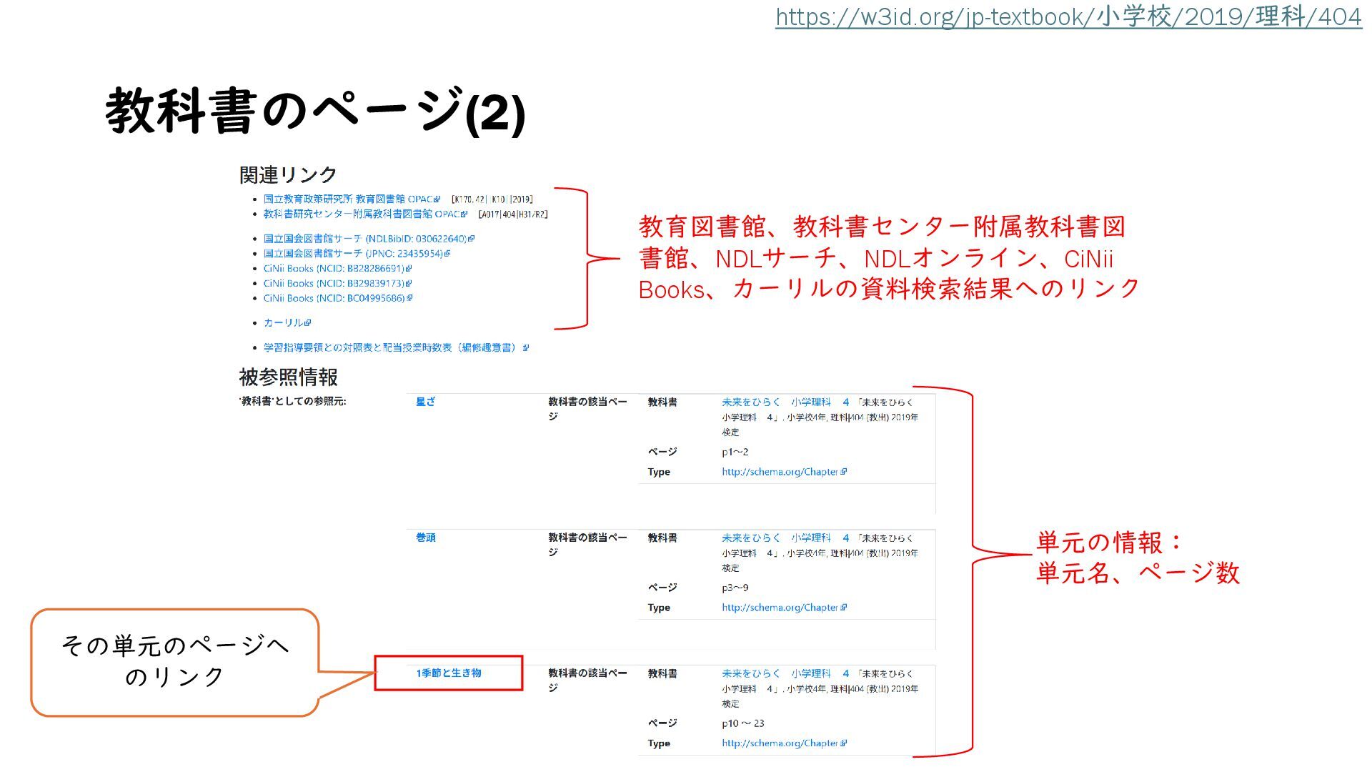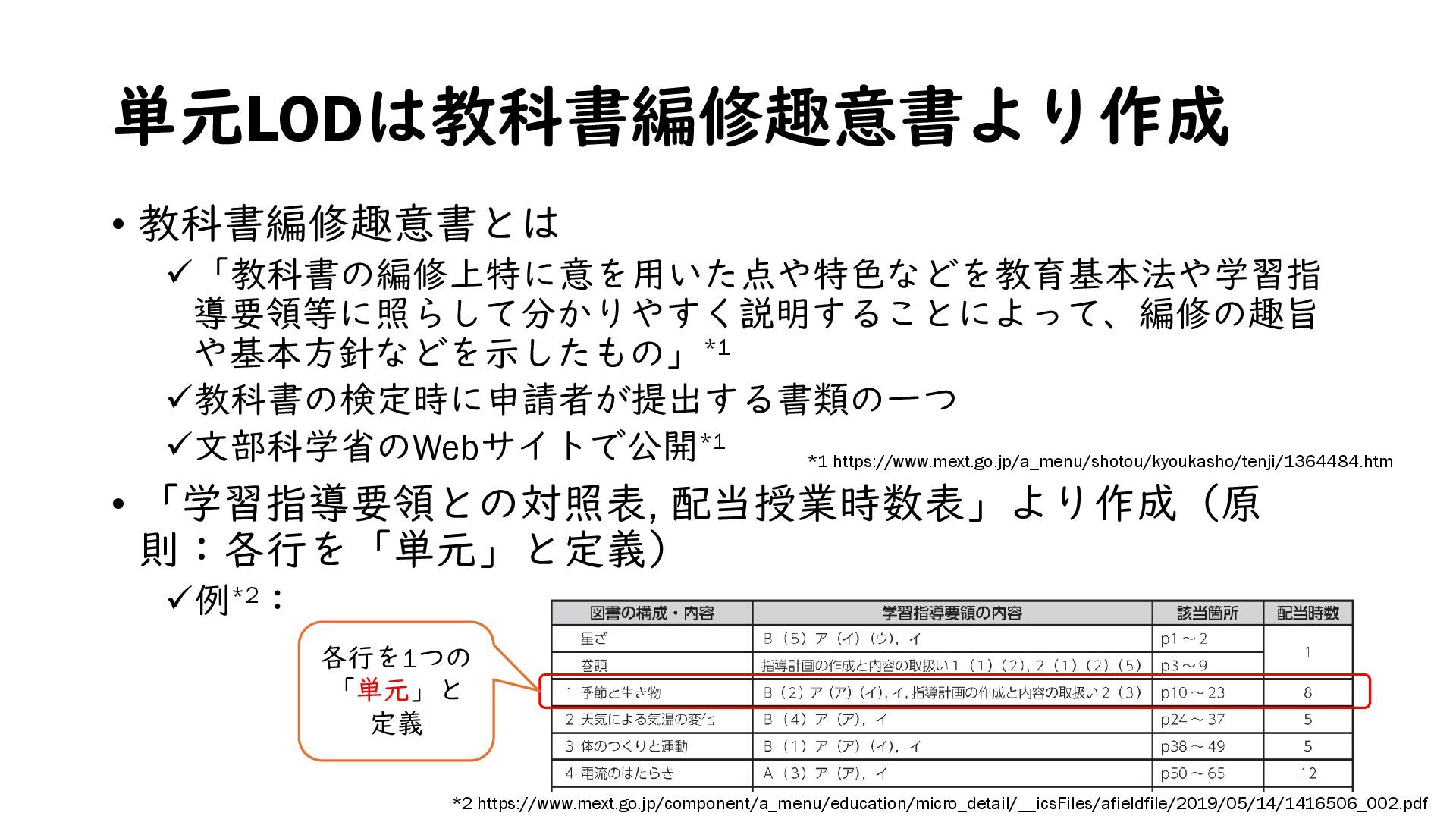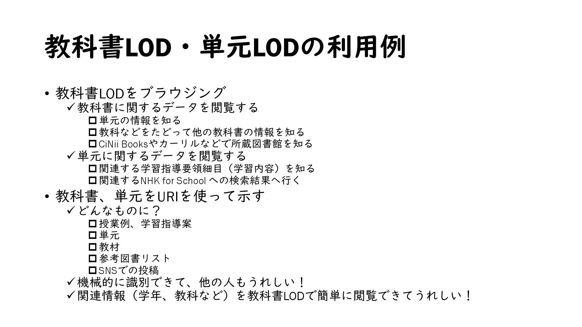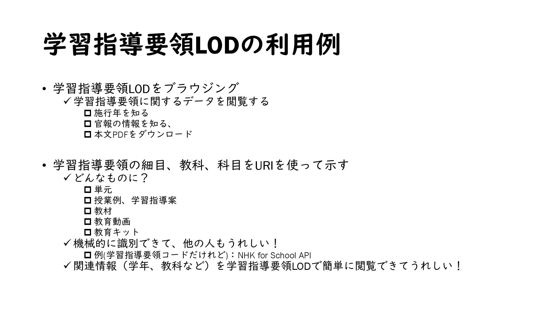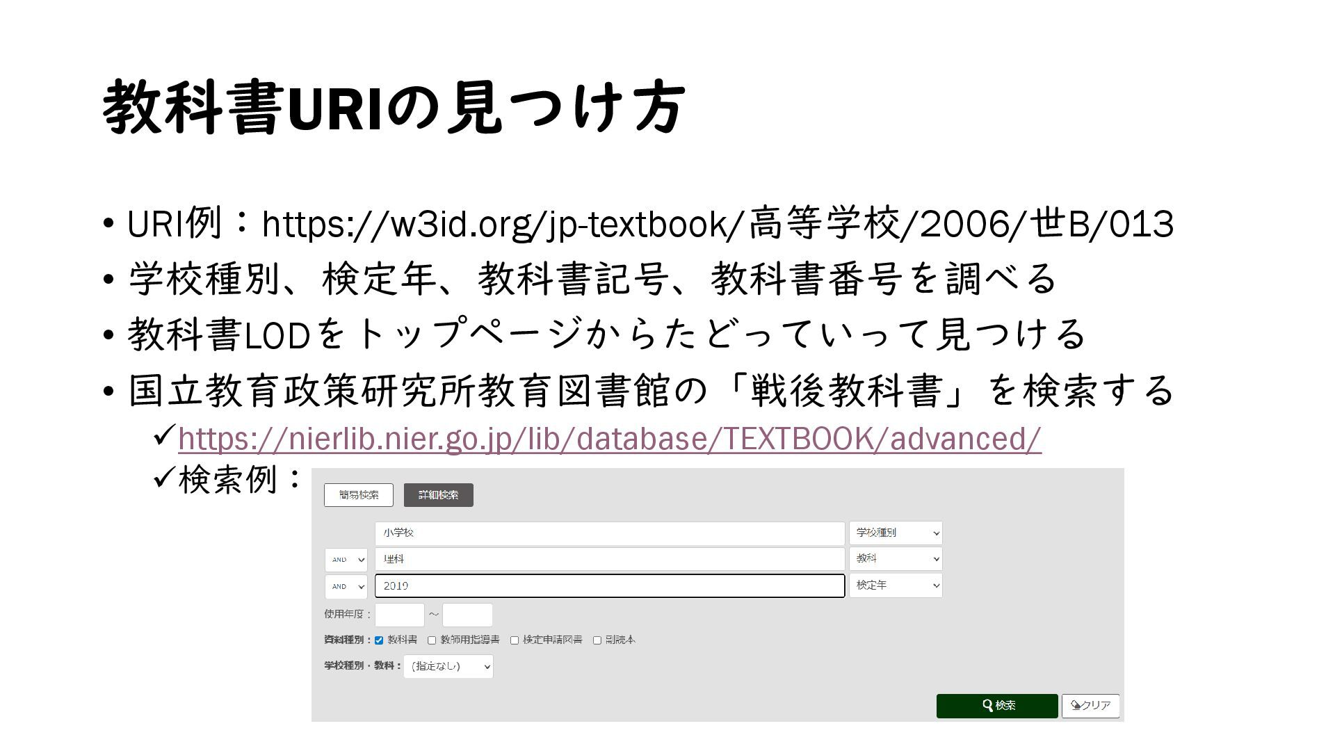 と。」 ✓URI: https://w3id.org/jp-cos/8260253221100000 • URIなので、リンクすることができる • URIを使ってウェブブラウザでアクセスすると: ✓関連する情報が見れたり ✓関連する内容の NHK for School の教育動画を検索出来たり ✓関連する教科書単元を簡単に検索できたりする。 6