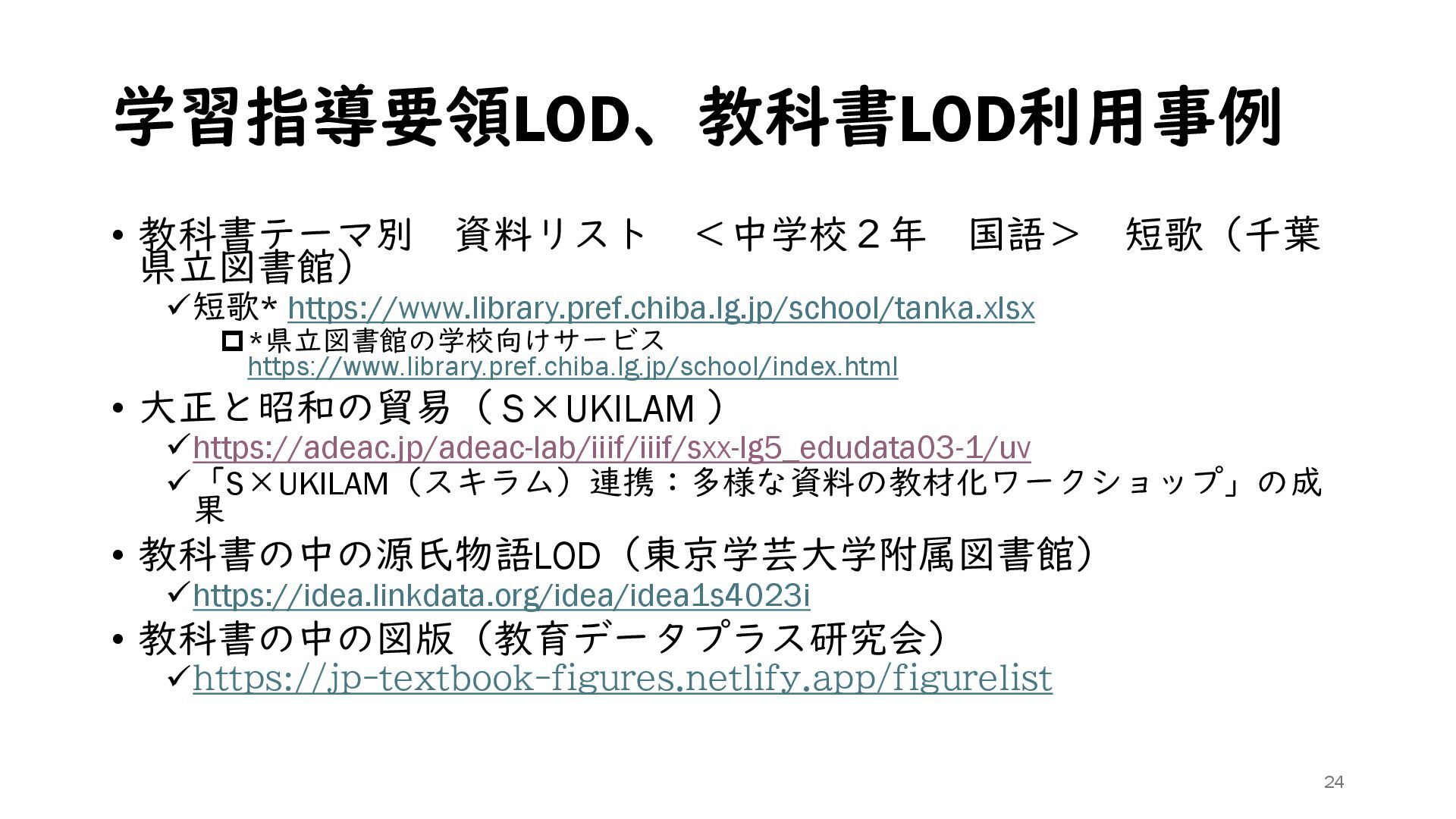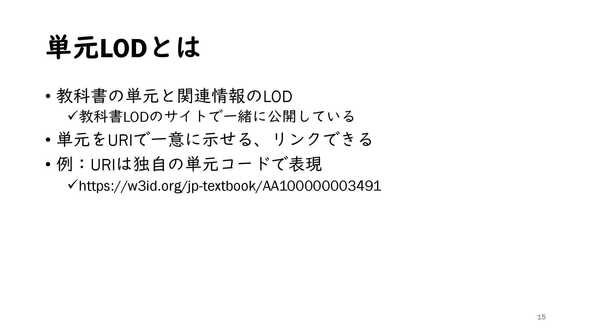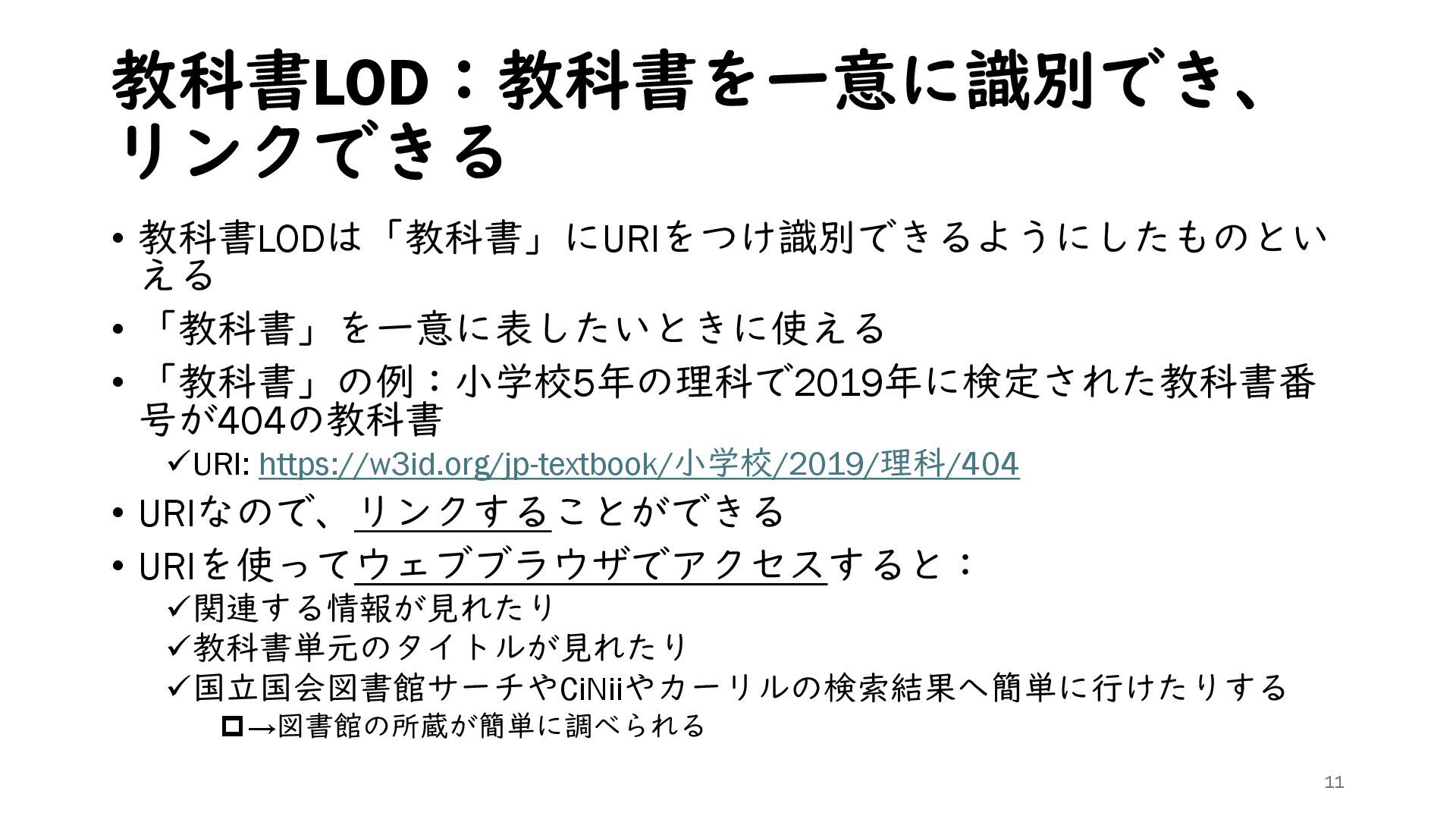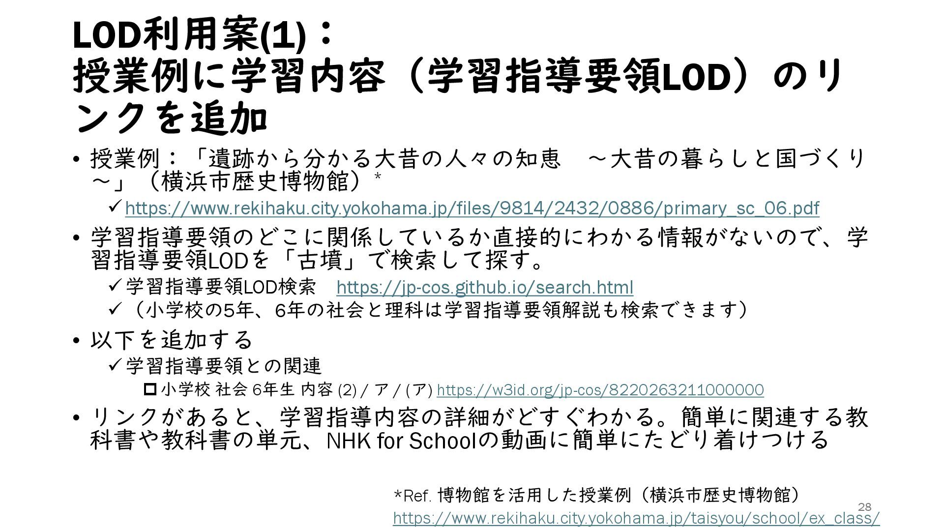 と。」 ✓URI: https://w3id.org/jp-cos/8260253221100000 • URIなので、リンクすることができる • URIを使ってウェブブラウザでアクセスすると: ✓関連する情報が見れたり ✓関連する内容の NHK for School の教育動画を検索出来たり ✓関連する教科書単元を簡単に検索できたりする。 6