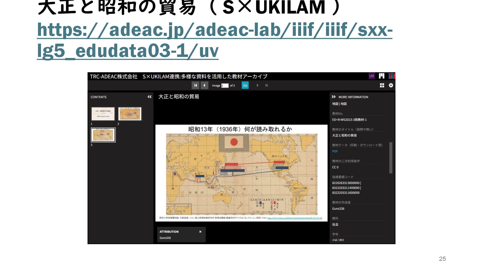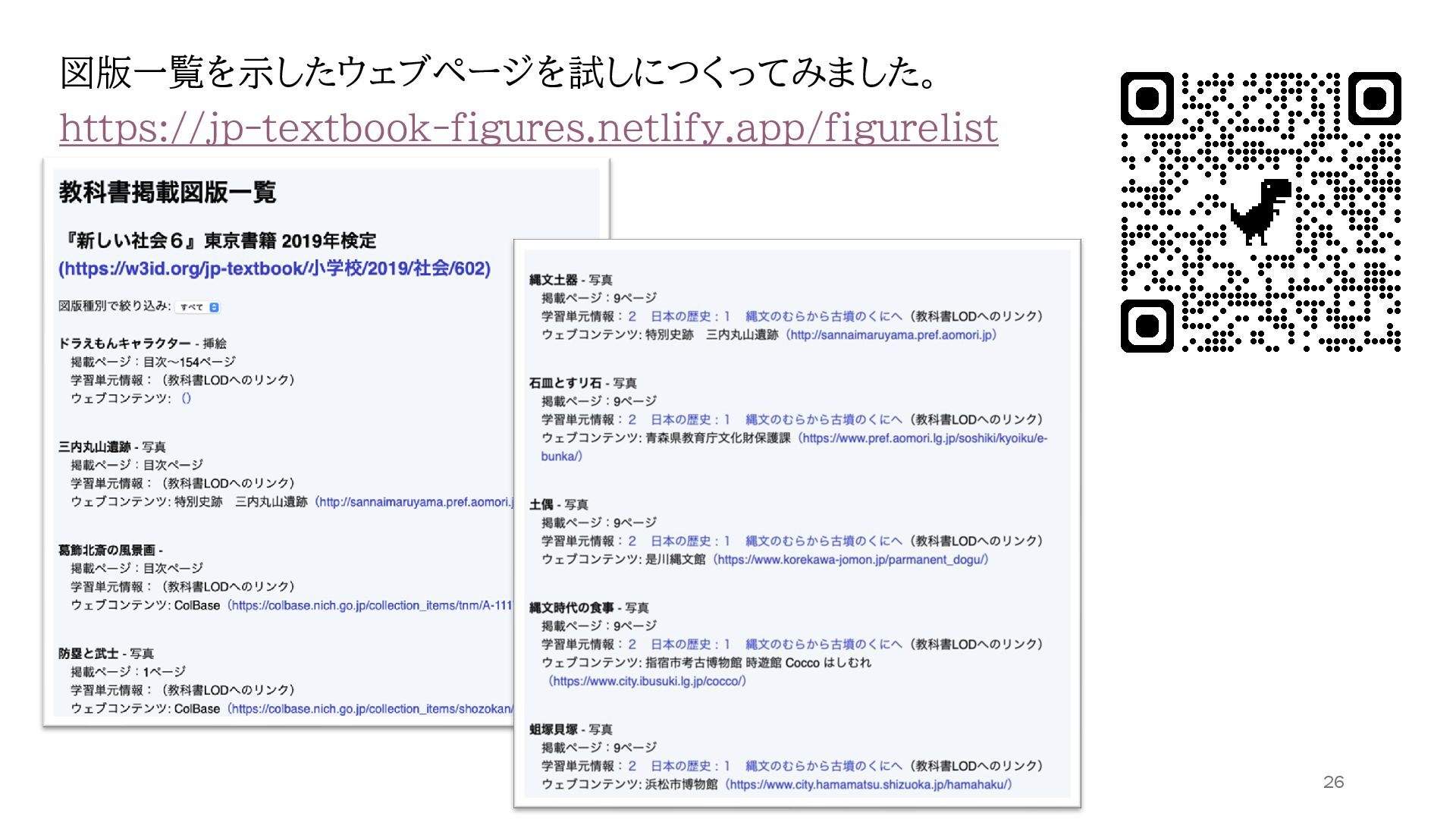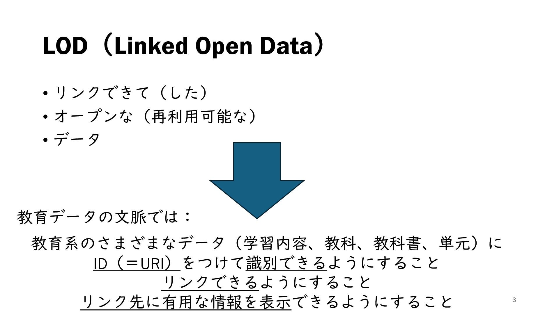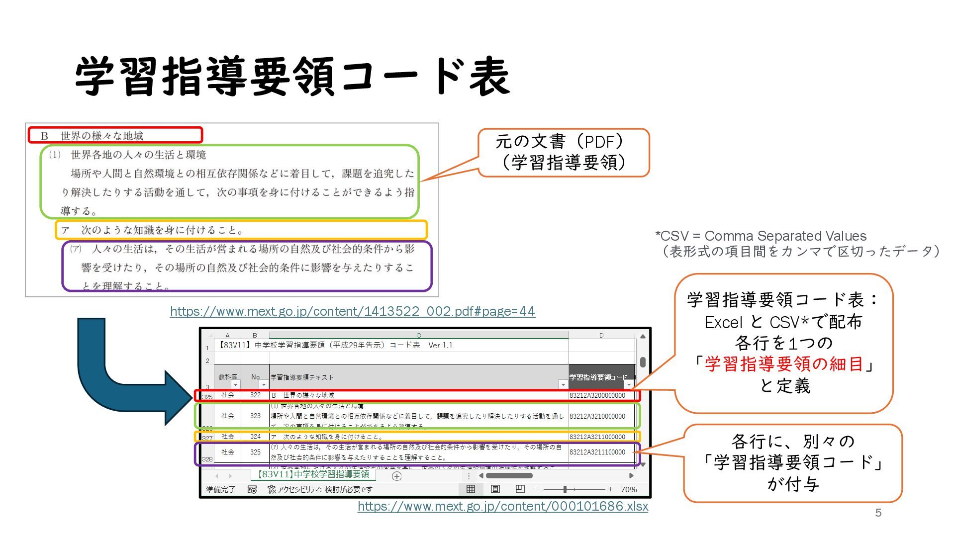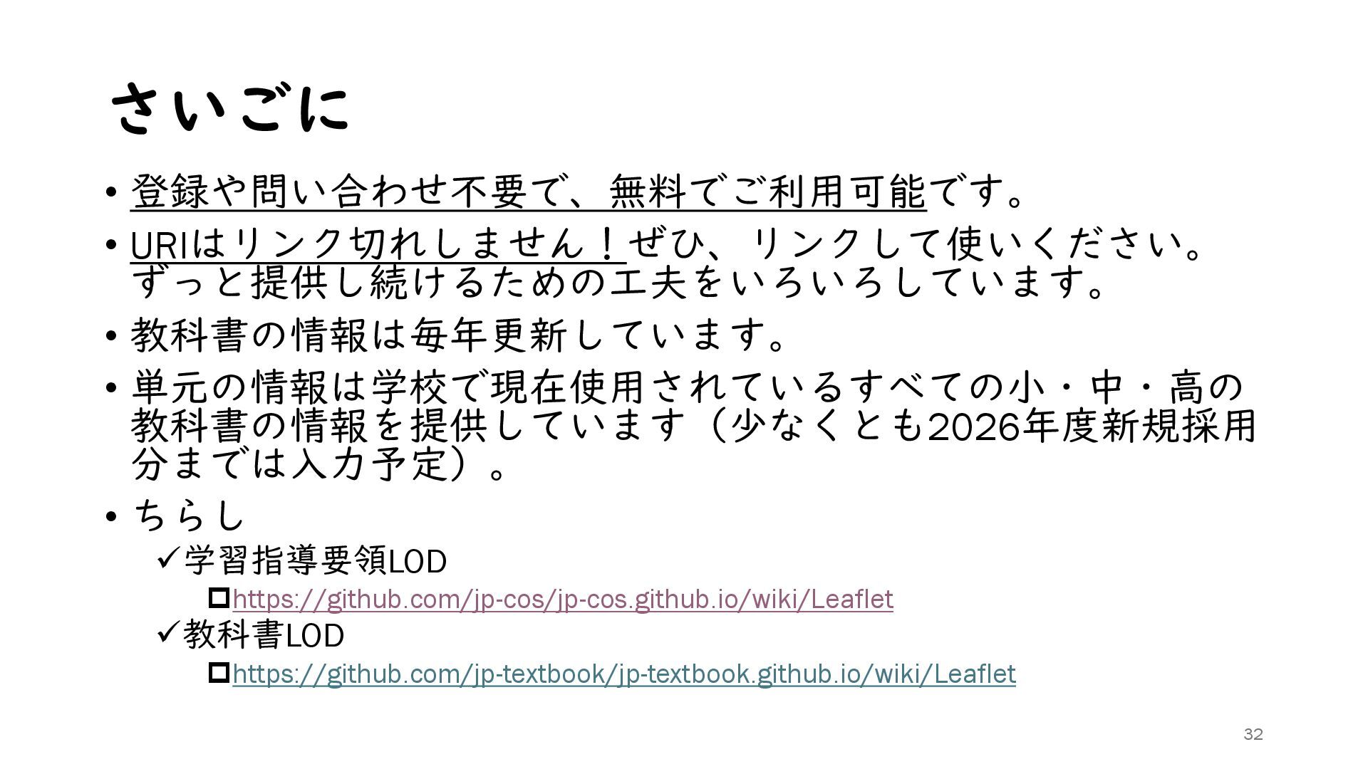 と。」 ✓URI: https://w3id.org/jp-cos/8260253221100000 • URIなので、リンクすることができる • URIを使ってウェブブラウザでアクセスすると: ✓関連する情報が見れたり ✓関連する内容の NHK for School の教育動画を検索出来たり ✓関連する教科書単元を簡単に検索できたりする。 6