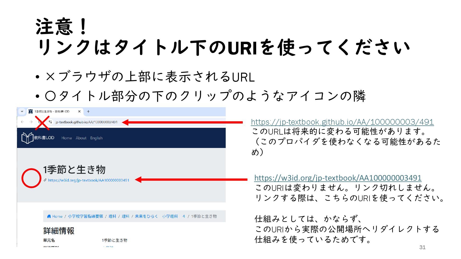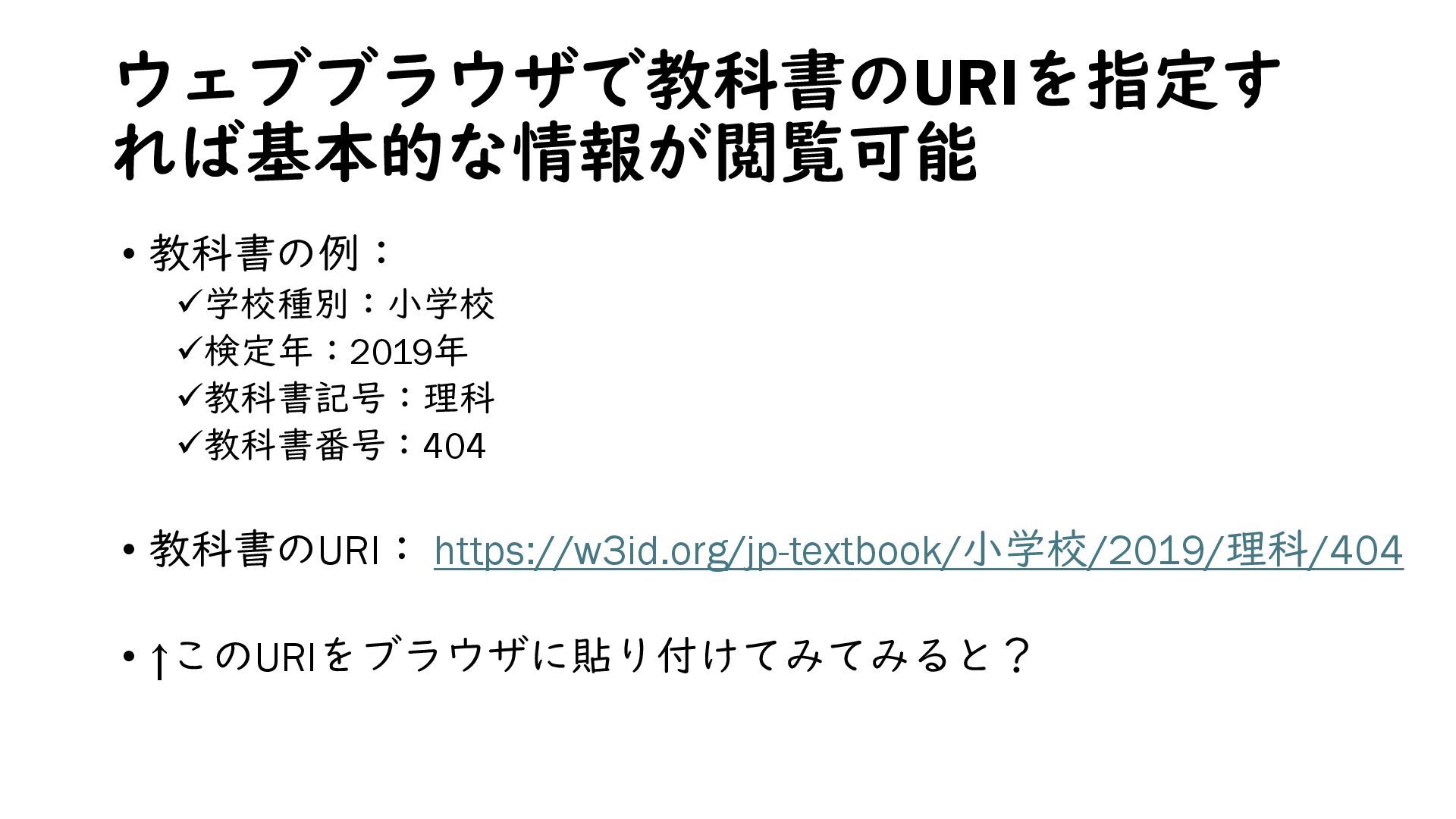 ✓URI: https://w3id.org/jp-textbook/AA100000003491 • URIなので、リンクすることができる • URIを使ってウェブブラウザでアクセスすると: ✓関連する情報が見れたり ✓対応する学習指導要領の細目(学習内容)が見れたり、 ✓↑に関連する内容の NHK for School の教育動画を検索出来たりする。 16