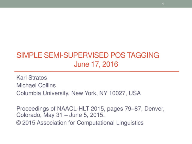 Datasets – universal treebank • Tagsets – (1) 45 tags (2) reduced to 12 tags • Derived Brown representation for following unlabeled data • English: 772 mi • German and Spanish: Google Ngram (German 64 bi, Sp. 83 bi) • Bit string derivation: Liang (2005), Stratos et al. (2014) • Word embedding : derived 50 dim. word embedding , CCA algorithm of Stratos et al. (2014) • Compared results with CRF 12