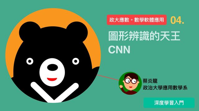 政⼤應數。數學軟體應⽤ 蔡炎龍 圖形辨識的天王 CNN 政治⼤學應⽤數學系 深度學習入⾨ 04.