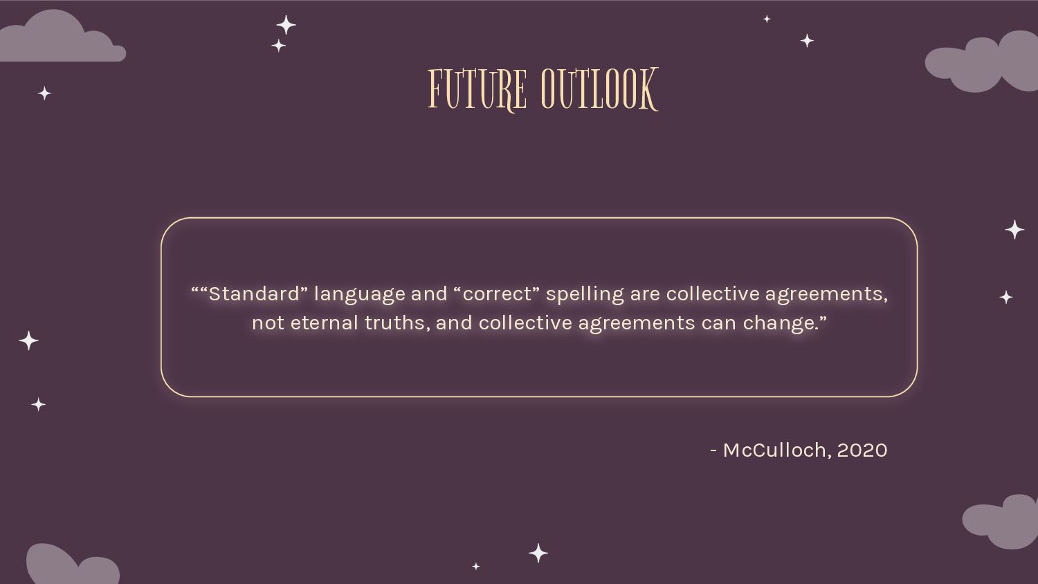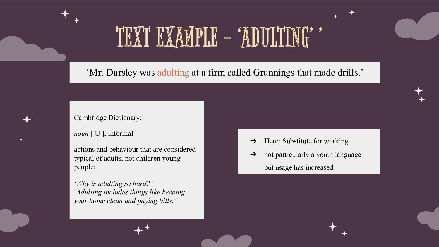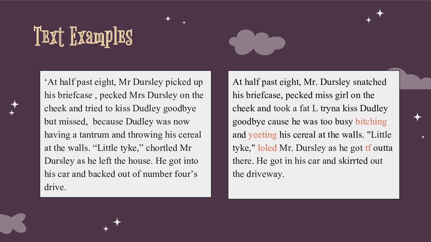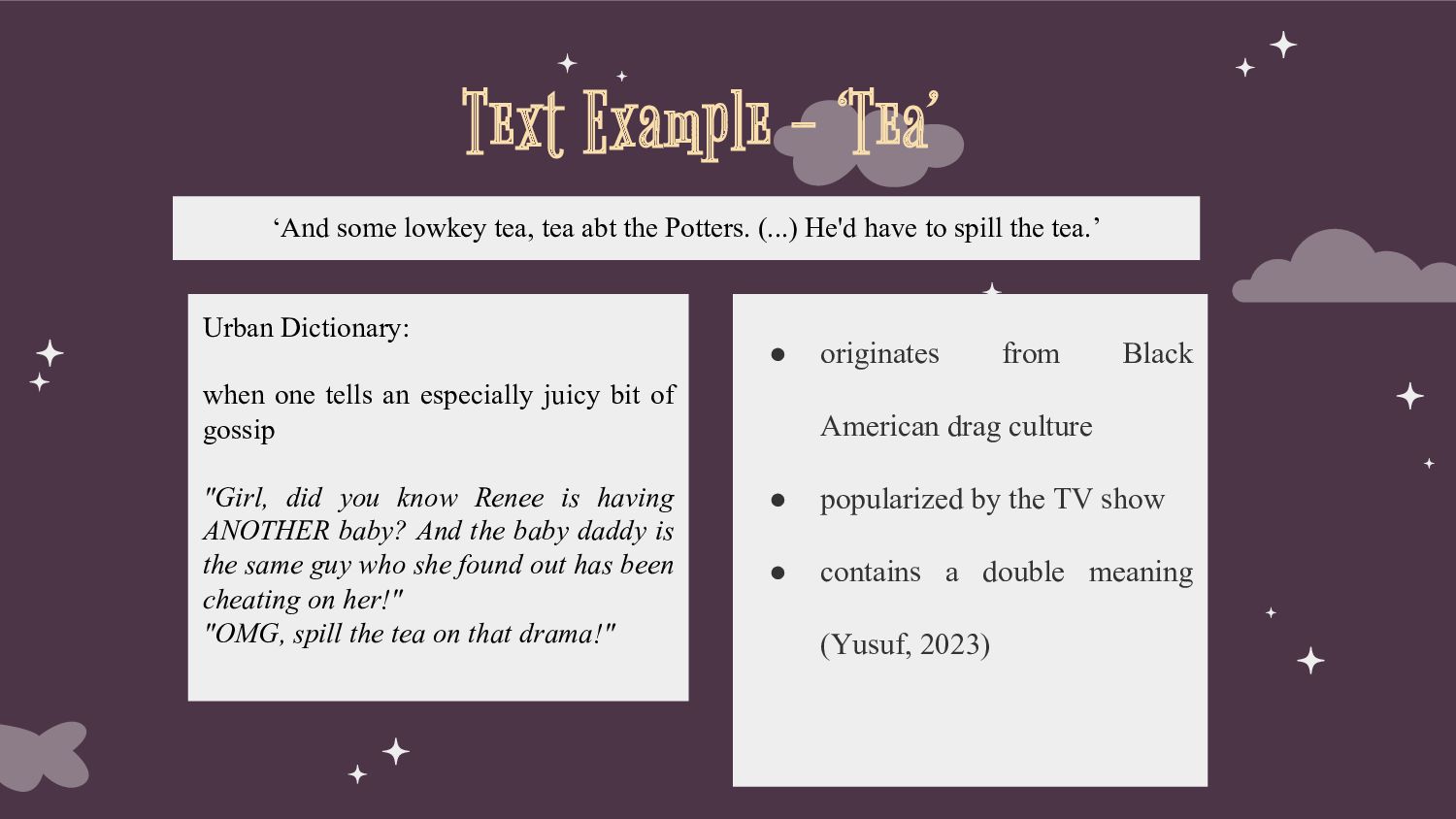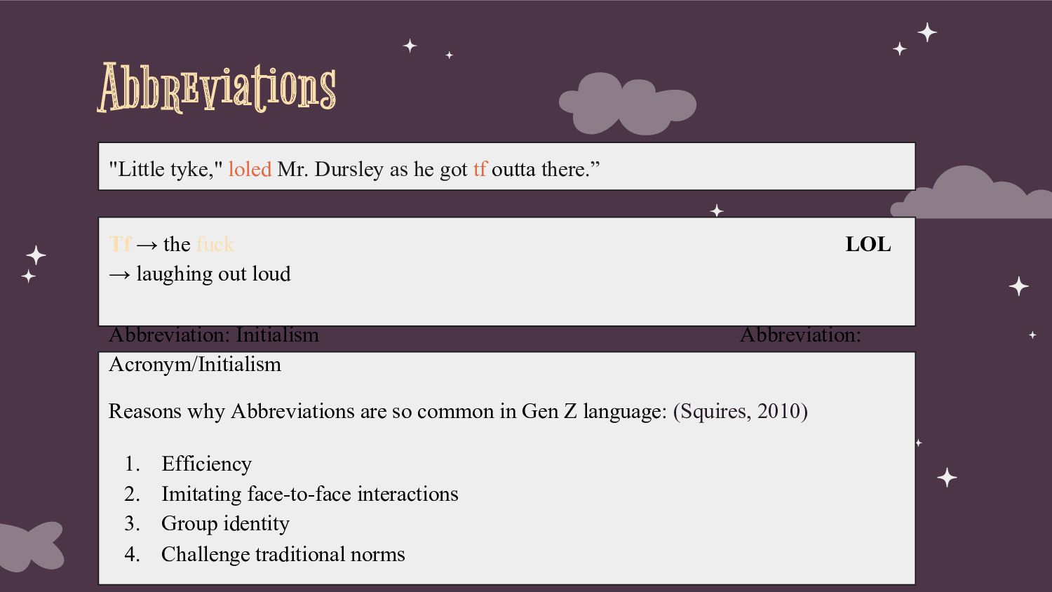 A Case of Youth Language in Local Commercial Discourse. Indonesian Journal of EFL and Linguistics, 6(2), 353. https://doi.org/10.21462/ijefl.v6i2.202 McCrindle, M., & Wolfinger, E. (2009). The ABC of XYZ: Understanding the global generations. UNSW Press. Poláková & Klímová. (2019). Mobile Technology and Generation Z in the English Language Classroom – A Preliminary Study. Education Sciences, 9(3), 203. https://doi.org/10.3390/educsci9030203 Rowling, J. K. (2009). Harry Potter and the philosopher’s stone. Bloomsbury. Unit. (2023). In Cambridge Dictionary. Cambridge University Press. https://dictionary.cambridge.org/dictionary/english/unit Valera, S. (2023). The semantics of noun-to-verb zero-derivation in English and Spanish. Zeitschrift für Sprachwissenschaft, 42(1), 153- 180. https://doi.org/10.1515/zfs-2022-2016 WP Company. (2019, December 15). A guide to how gender-neutral language is developing around the world. The Washington Post. https://www.washingtonpost.com/world/2019/12/15/guide-how-gender-neutral-language-is-developing-around-world/ Yoon, J., Gomez, L., Gonzales, J., Martinez, R., Torres, K., Williams, V., Davis, M., & Cammarota, J. (2021). Spill the Tea. In J. Cammarota (Ed.), Liberatory Practices for Learning (pp. 47–68). Springer International Publishing. https://doi.org/10.1007/978-3-030-56685-2_3 Yusuf, Y. Q., Fata, I. A., & Aini, R. (2023). “GOTCHUU!”: THE USE OF SLANG IN SOCIAL MEDIA BY GENERATION Z. LiNGUA: Jurnal Ilmu Bahasa Dan Sastra, 17(2), 167–174. https://doi.org/10.18860/ling.v17i2.17756