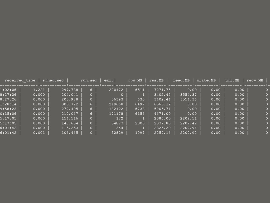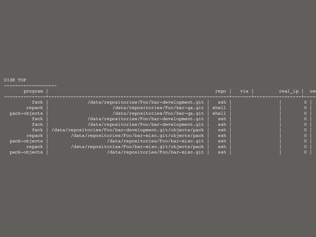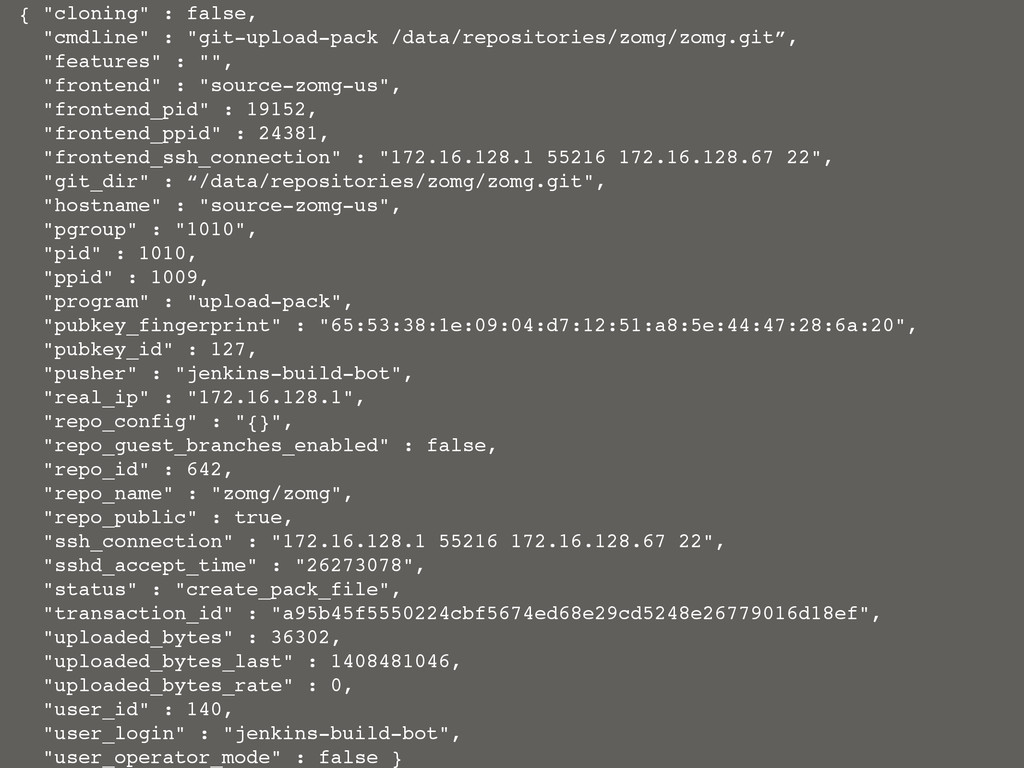 "",! "frontend" : "source-zomg-us",! "frontend_pid" : 19152,! "frontend_ppid" : 24381,! "frontend_ssh_connection" : "172.16.128.1 55216 172.16.128.67 22",! "git_dir" : “/data/repositories/zomg/zomg.git",! "hostname" : "source-zomg-us",! "pgroup" : "1010",! "pid" : 1010,! "ppid" : 1009,! "program" : "upload-pack",! "pubkey_fingerprint" : "65:53:38:1e:09:04:d7:12:51:a8:5e:44:47:28:6a:20",! "pubkey_id" : 127,! "pusher" : "jenkins-build-bot",! "real_ip" : "172.16.128.1",! "repo_config" : "{}",! "repo_guest_branches_enabled" : false,! "repo_id" : 642,! "repo_name" : "zomg/zomg",! "repo_public" : true,! "ssh_connection" : "172.16.128.1 55216 172.16.128.67 22",! "sshd_accept_time" : "26273078",! "status" : "create_pack_file",! "transaction_id" : "a95b45f5550224cbf5674ed68e29cd5248e26779016d18ef",! "uploaded_bytes" : 36302,! "uploaded_bytes_last" : 1408481046,! "uploaded_bytes_rate" : 0,! "user_id" : 140,! "user_login" : "jenkins-build-bot",! "user_operator_mode" : false }