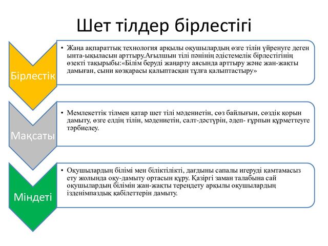 өзге тілін үйренуге деген ынта-ықыласын арттыру.Ағылшын тілі пәнінің әдістемелік бірлестігінің өзекті тақырыбы:«Білім беруді жаңарту аясында арттыру және жан-жақты дамыған, сыни көзқарасы қалыптасқан тұлға қалыптастыру» Мақсаты • Мемлекеттік тілмен қатар шет тілі мәдениетін, сөз байлығын, сөздік қорын дамыту, өзге елдің тілін, мәдениетін, салт-дәстүрін, әдеп- ғұрпын құрметтеуге тәрбиелеу. Міндеті • Оқушылардың білімі мен біліктілікті, дағдыны сапалы игеруді қамтамасыз ету жолында оқу-дамыту ортасын құру. Қазіргі заман талабына сай оқушылардың білімін жан-жақты тереңдету арқылы оқушылардың ізденімпаздық қабілеттерін дамыту.