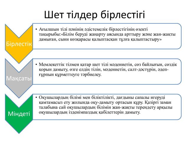 өзекті тақырыбы:«Білім беруді жаңарту аясында арттыру және жан-жақты дамыған, сыни көзқарасы қалыптасқан тұлға қалыптастыру» Мақсаты • Мемлекеттік тілмен қатар шет тілі мәдениетін, сөз байлығын, сөздік қорын дамыту, өзге елдің тілін, мәдениетін, салт-дәстүрін, әдеп- ғұрпын құрметтеуге тәрбиелеу. Міндеті • Оқушылардың білімі мен біліктілікті, дағдыны сапалы игеруді қамтамасыз ету жолында оқу-дамыту ортасын құру. Қазіргі заман талабына сай оқушылардың білімін жан-жақты тереңдету арқылы оқушылардың ізденімпаздық қабілеттерін дамыту.