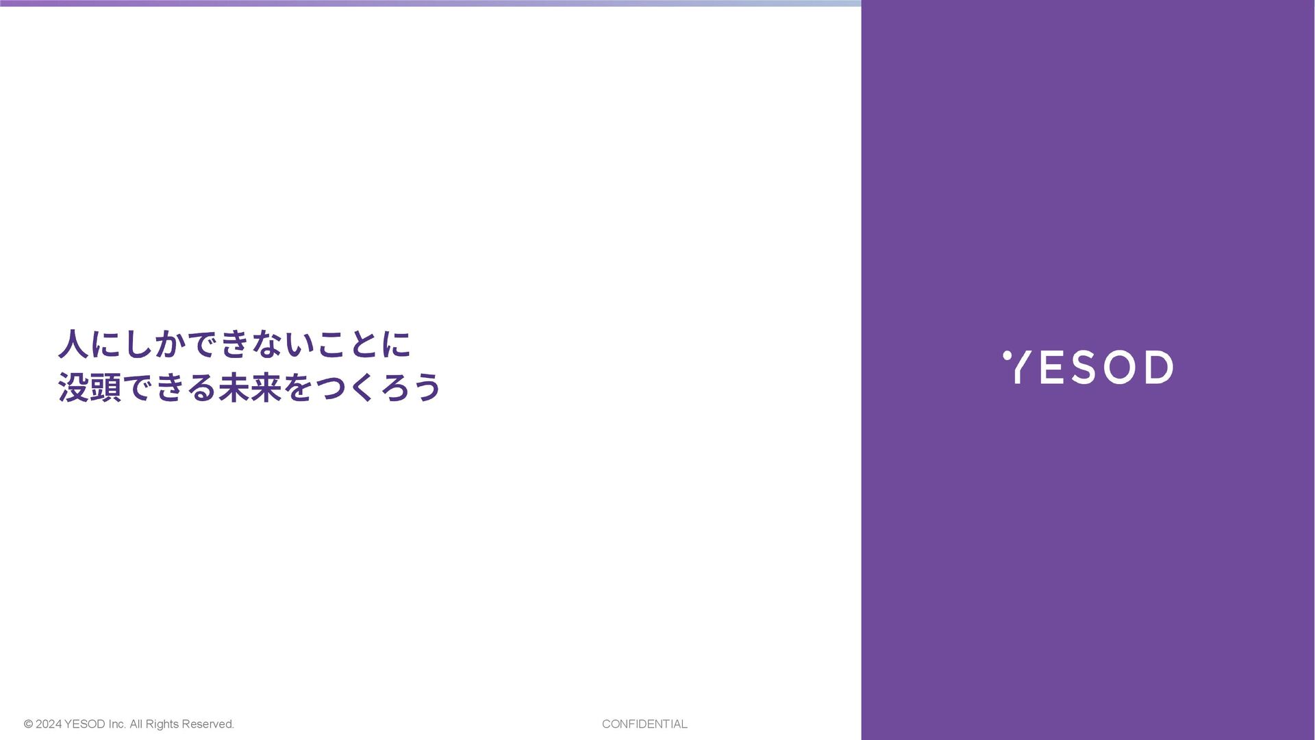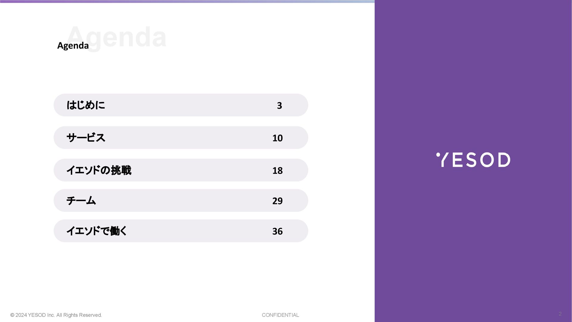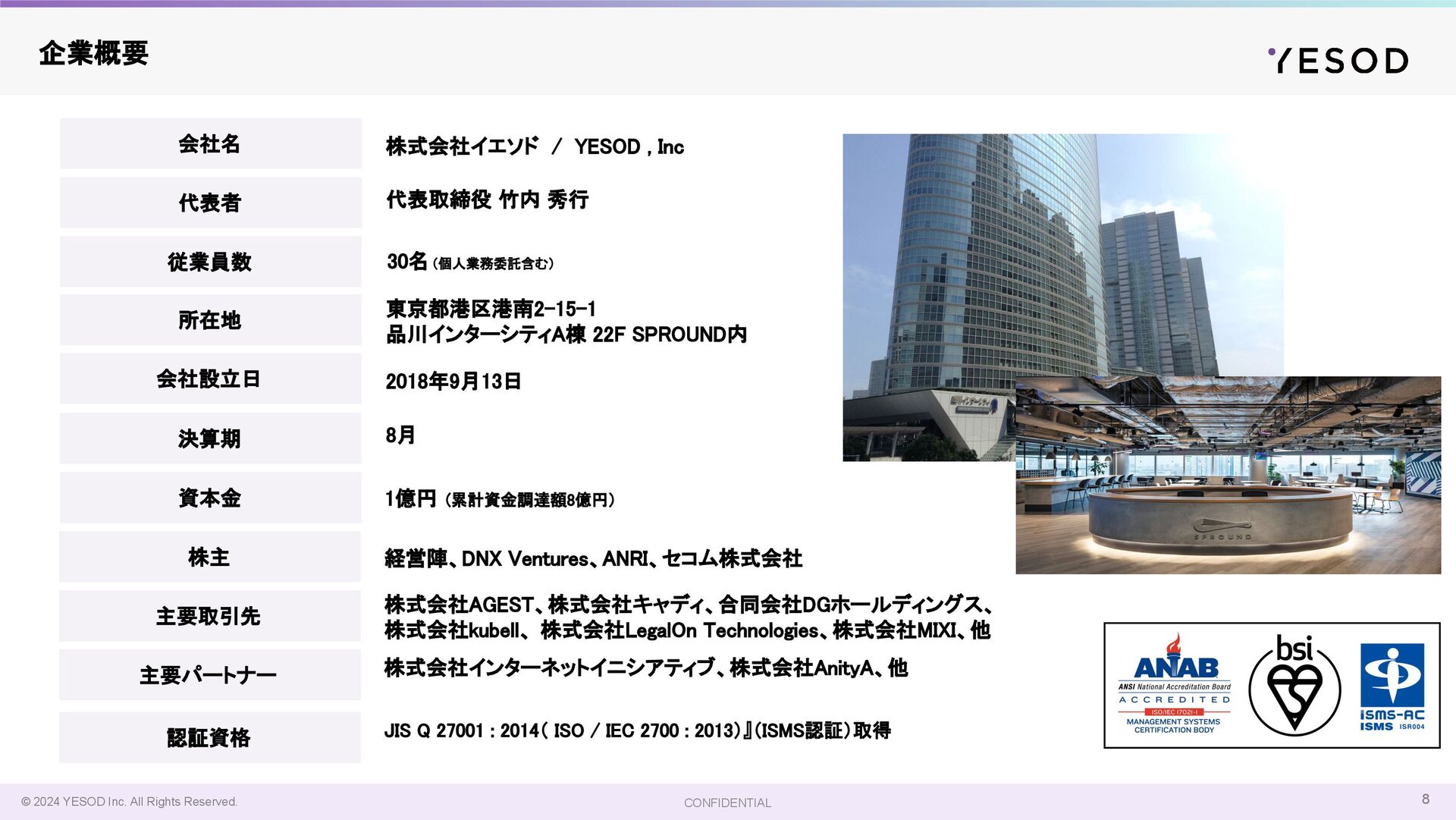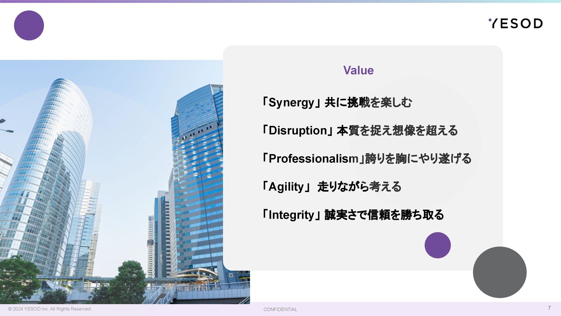 YESOD Inc. All Rights Reserved. CONFIDENTIAL 「Synergy」 共に挑戦を楽しむ 「Disruption」 本質を捉え想像を超える 「Professionalism」誇りを胸にやり遂げる 「Agility」 走りながら考える 「Integrity」 誠実さで信頼を勝ち取る Value 7