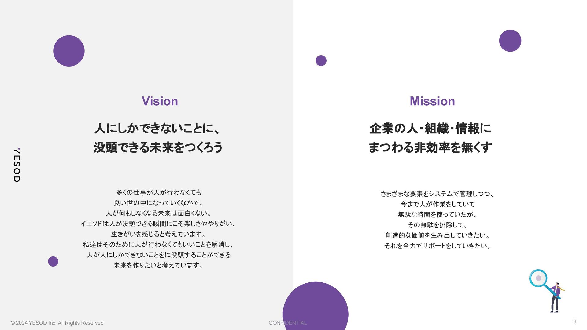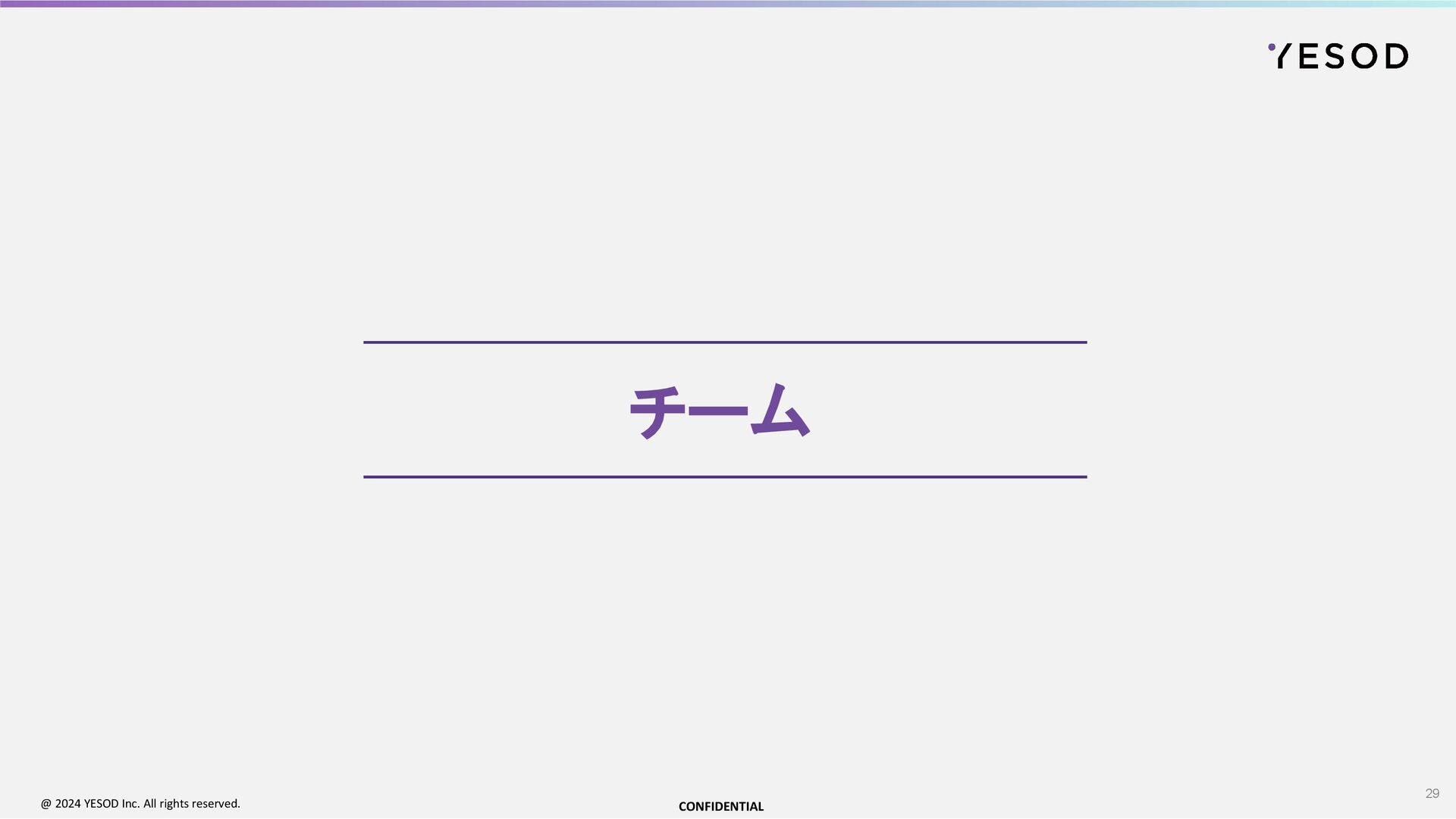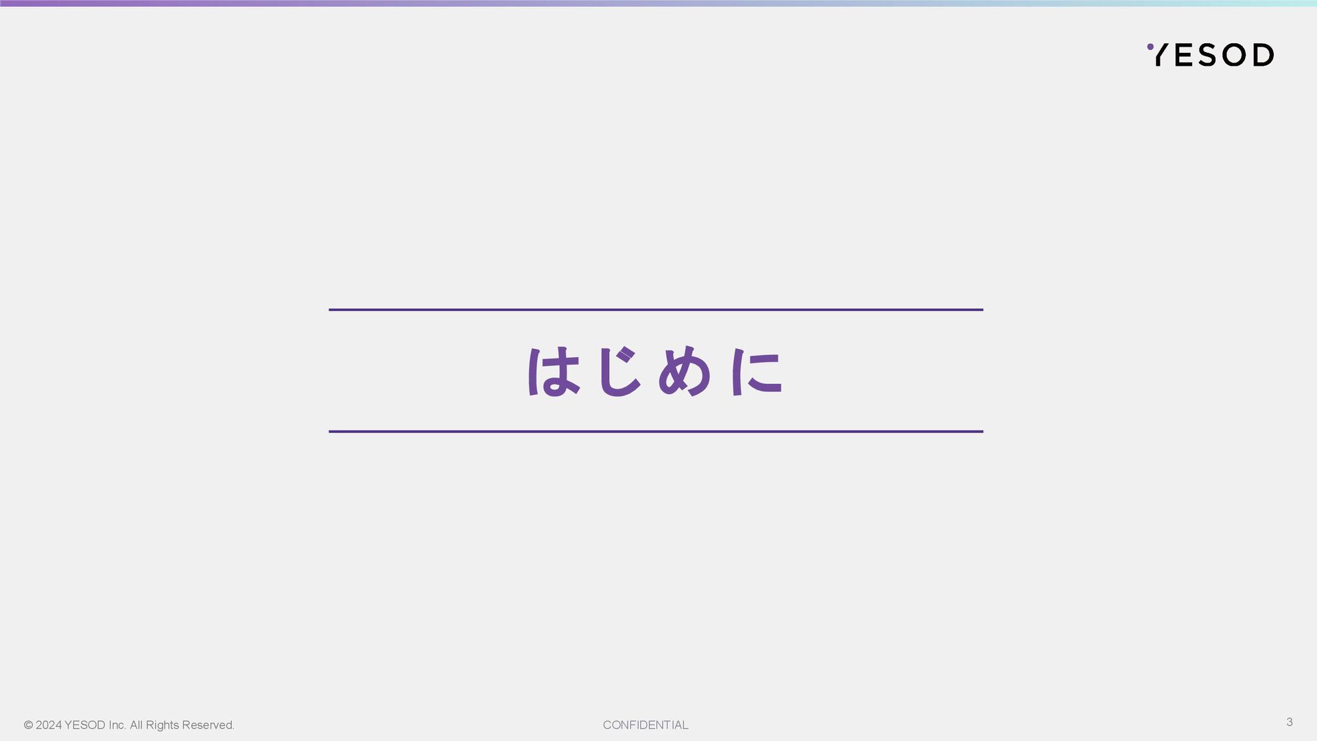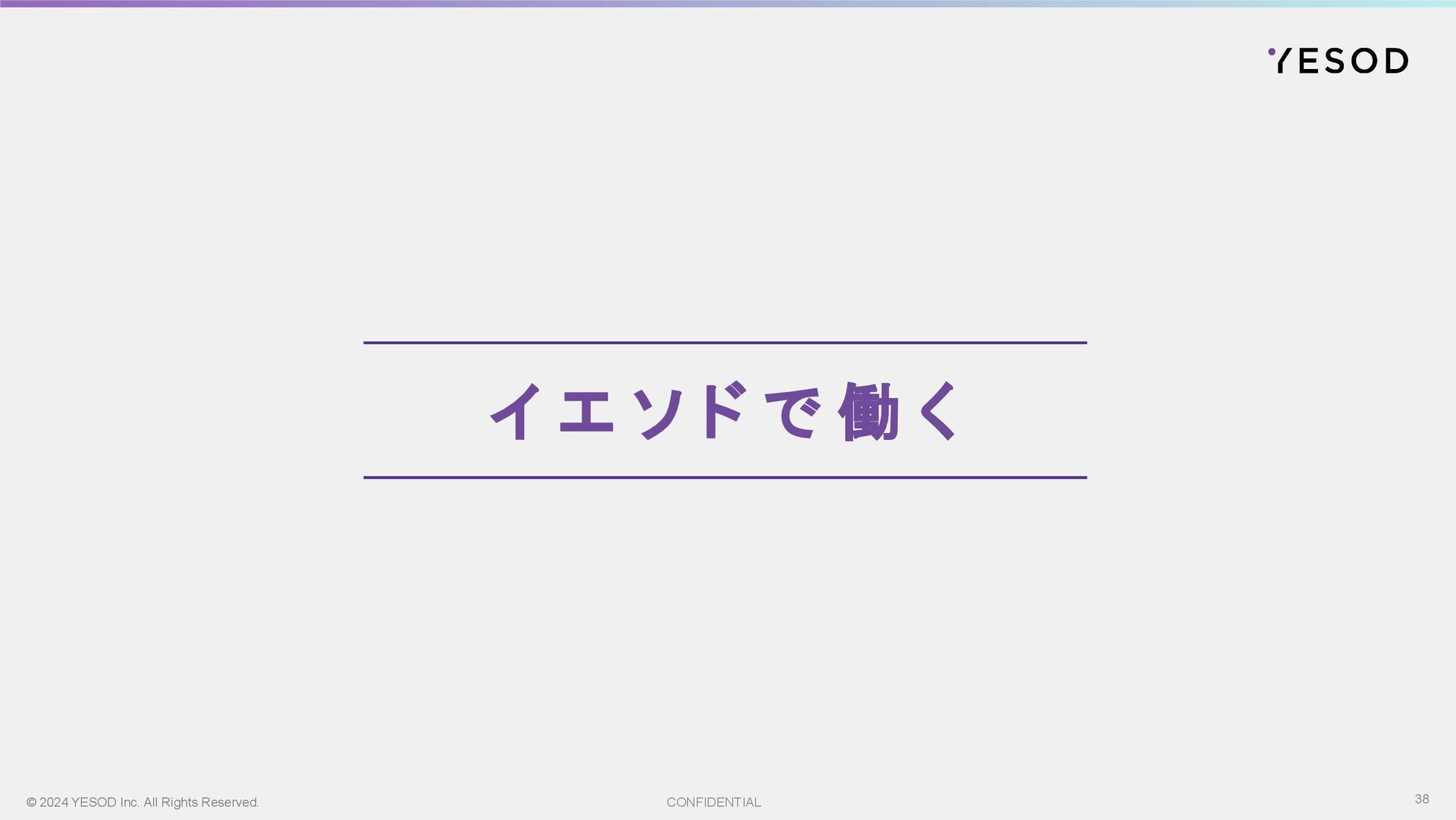 YESOD Inc. All Rights Reserved. CONFIDENTIAL 「Synergy」 共に挑戦を楽しむ 「Disruption」 本質を捉え想像を超える 「Professionalism」誇りを胸にやり遂げる 「Agility」 走りながら考える 「Integrity」 誠実さで信頼を勝ち取る Value 7