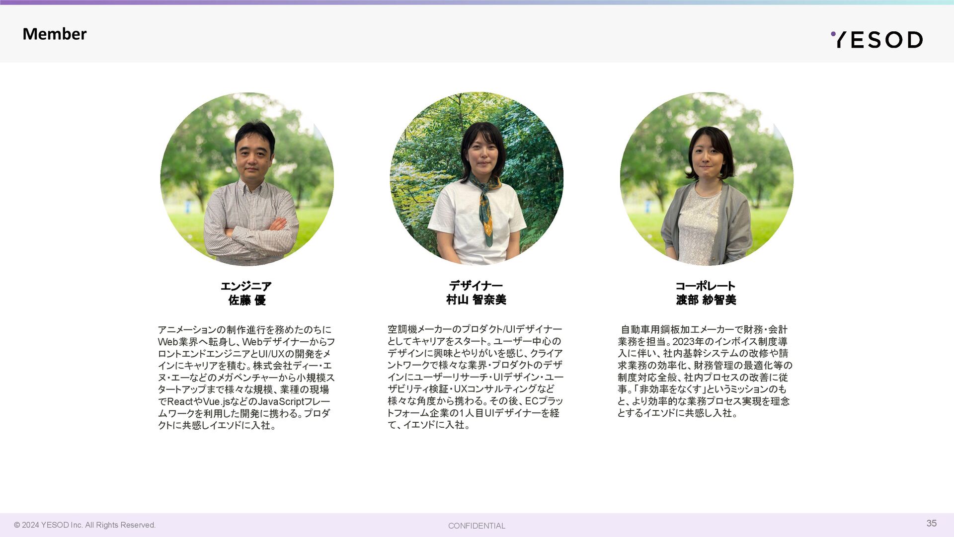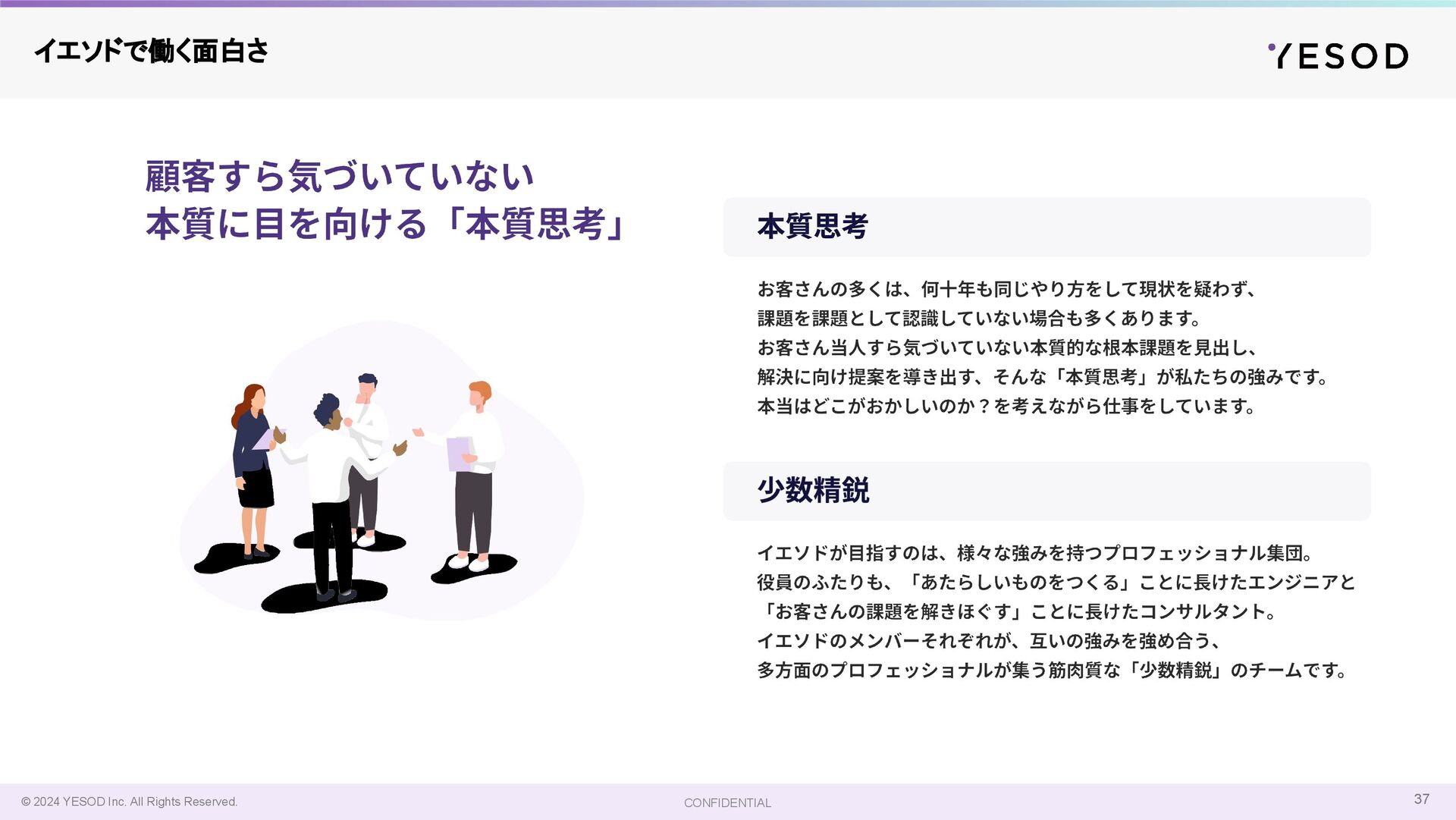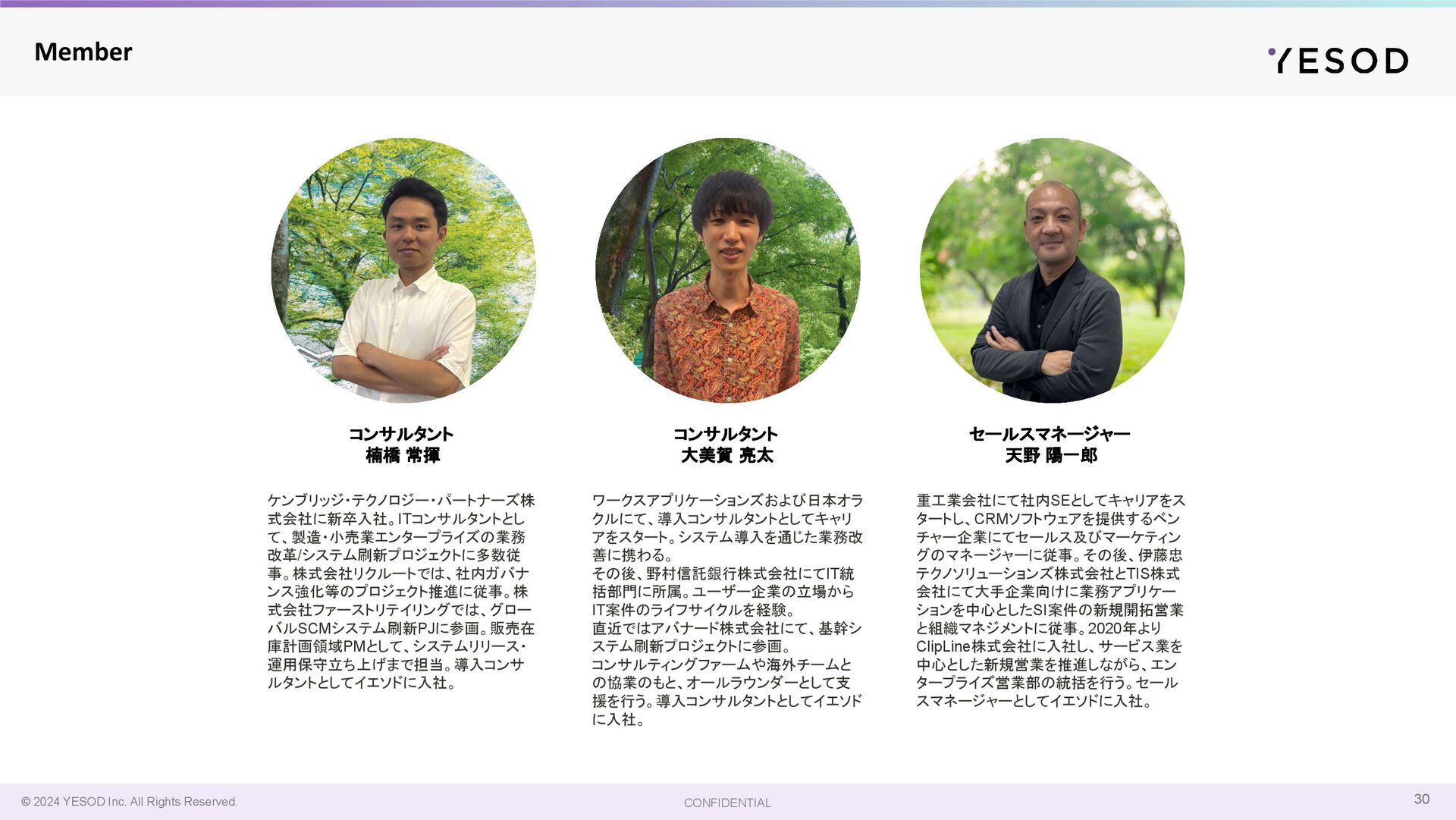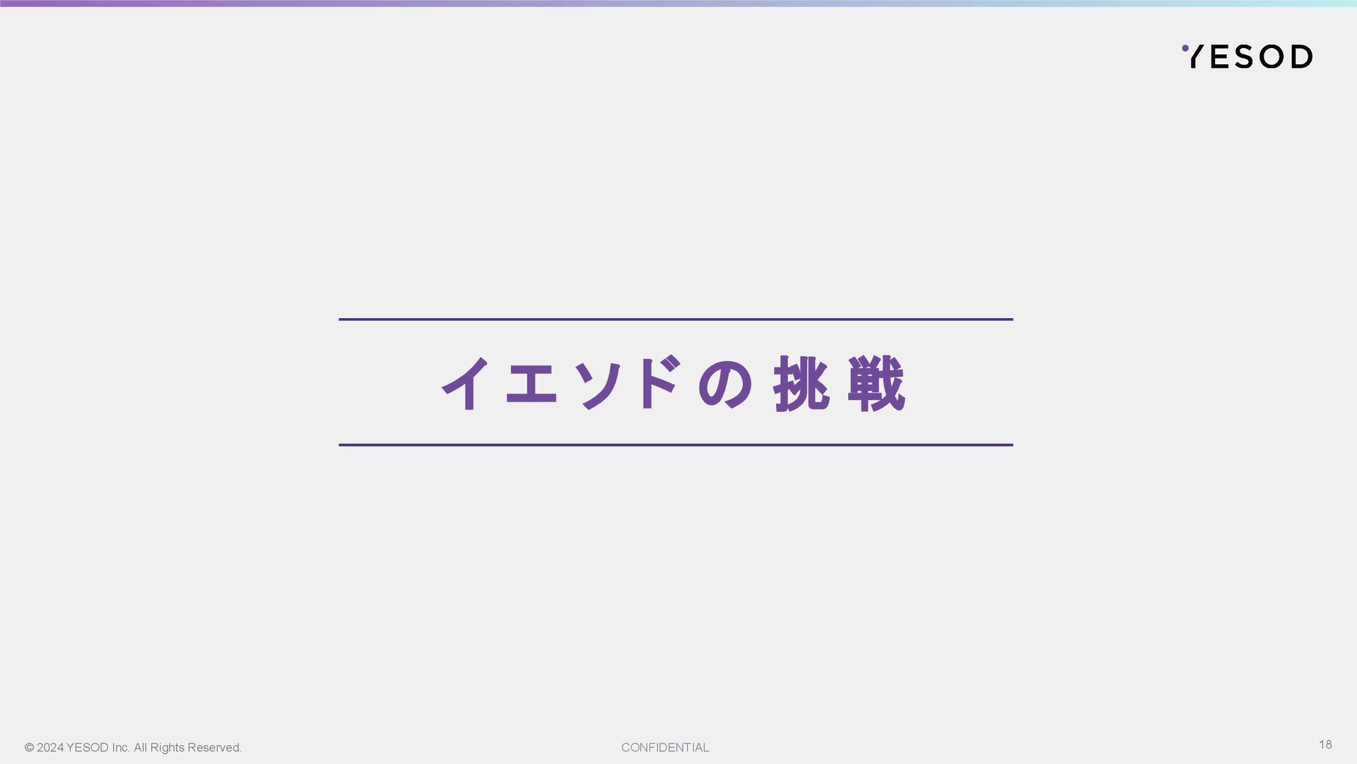 YESOD Inc. All Rights Reserved. CONFIDENTIAL 「Synergy」 共に挑戦を楽しむ 「Disruption」 本質を捉え想像を超える 「Professionalism」誇りを胸にやり遂げる 「Agility」 走りながら考える 「Integrity」 誠実さで信頼を勝ち取る Value 7