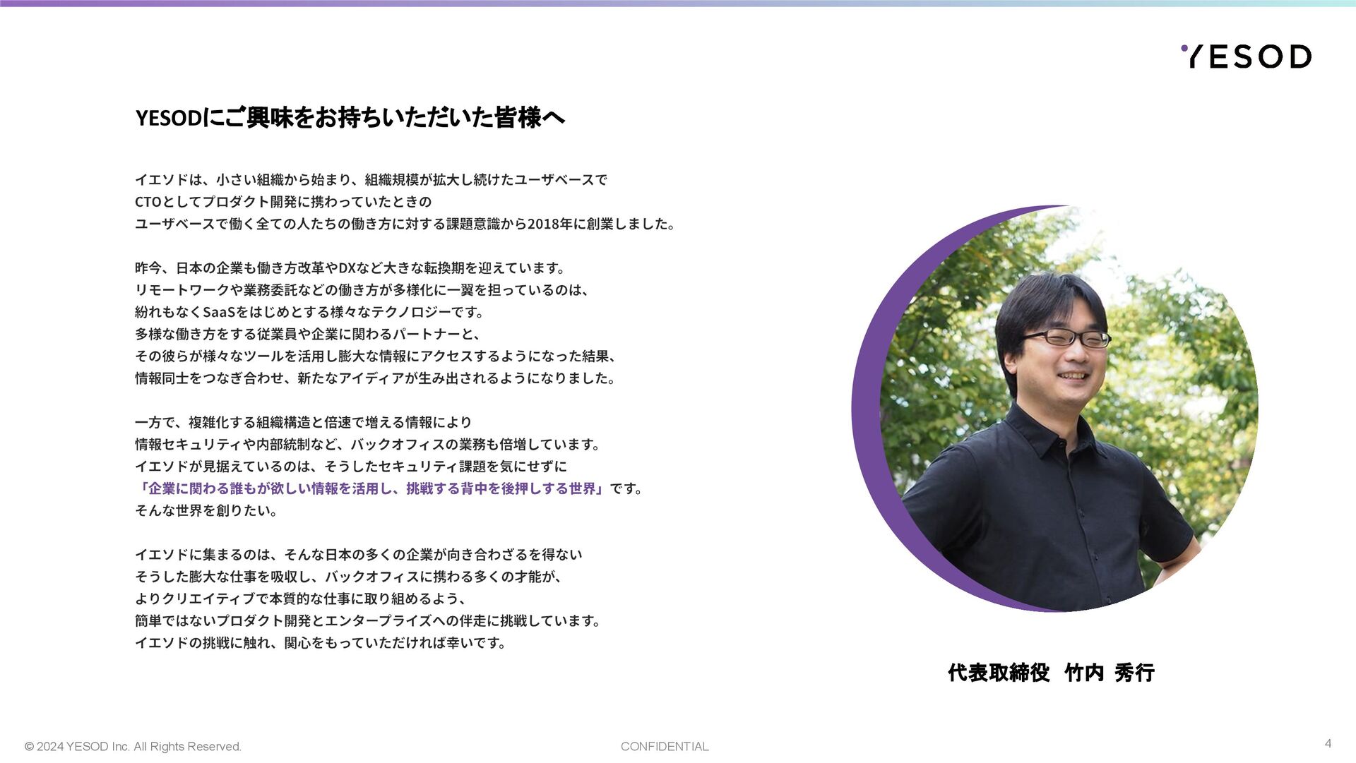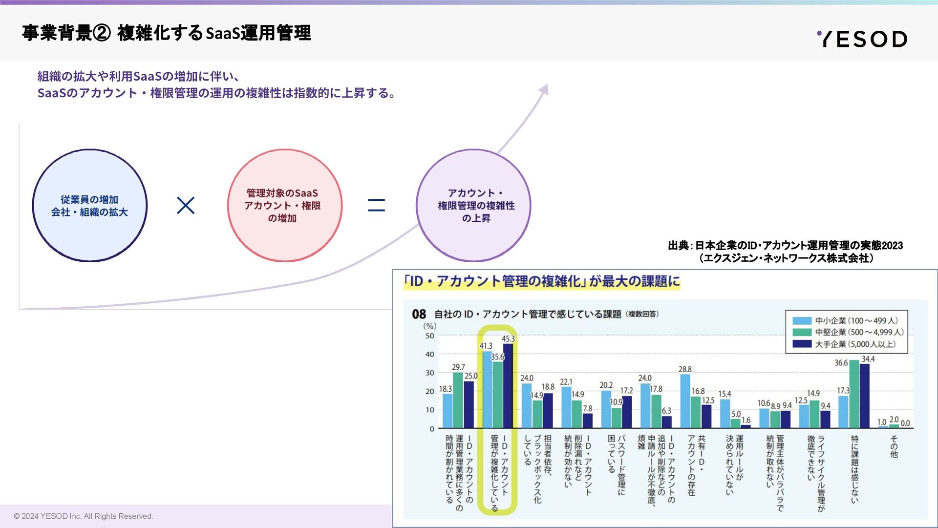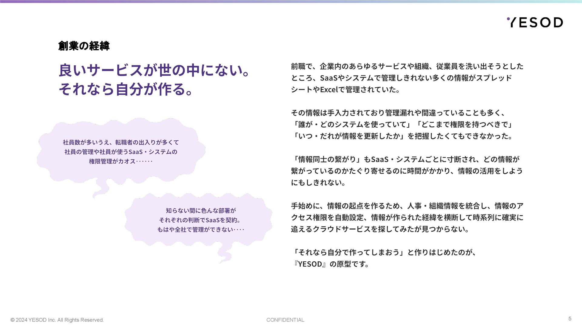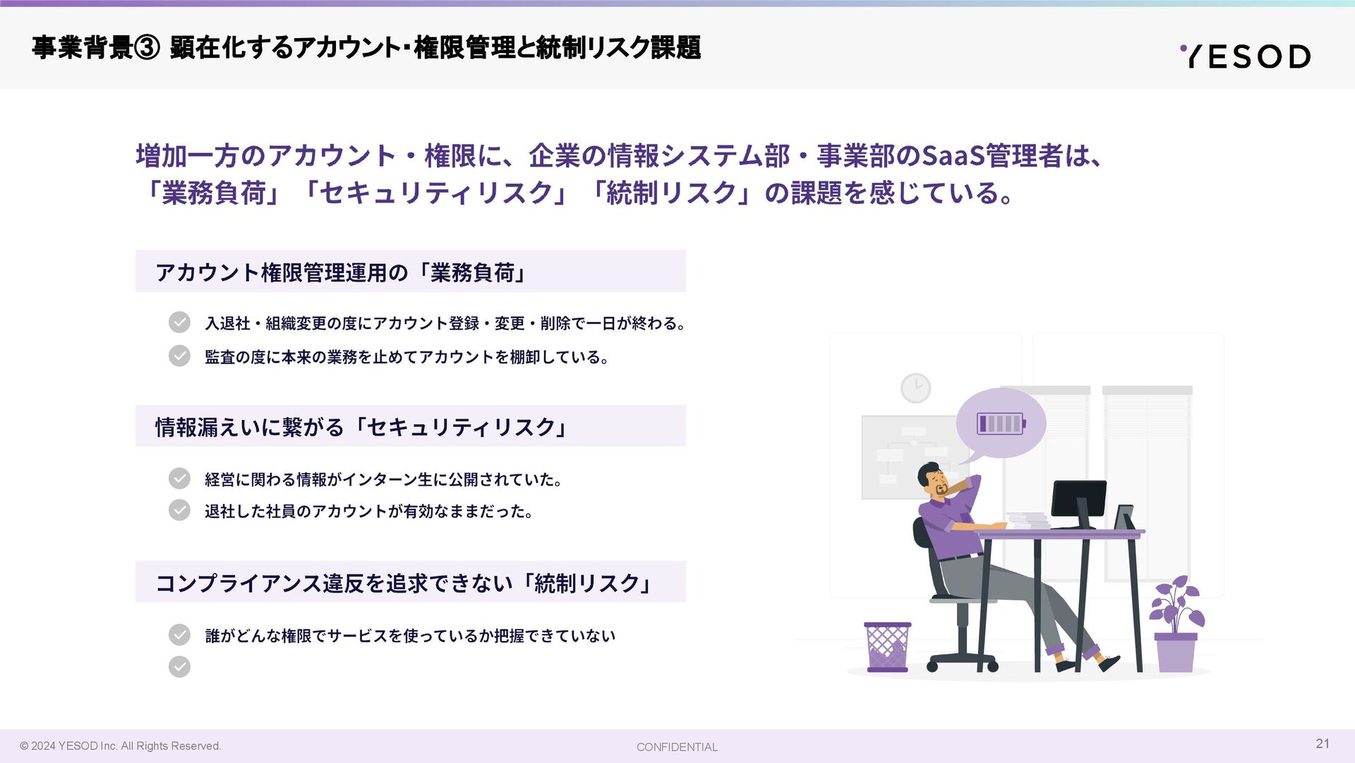 YESOD Inc. All Rights Reserved. CONFIDENTIAL 19 事業背景① SaaS利用の浸透・拡大 「働き方の多様化」、「DX推進」、「クラウドシフト」の流れから業務システムを中心にSaaS化が不可逆な流れとして進んでいる エンタープライスでは1社あたり 数百のSaaS利用 も一般的 ※出典:DNX VenturesがSaaS for SaaS領域に注目する理由 (2024年8月6日 note記事)
