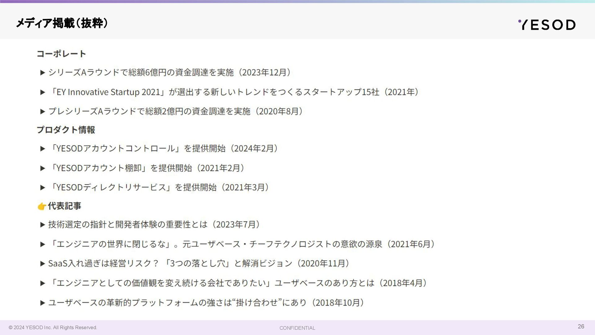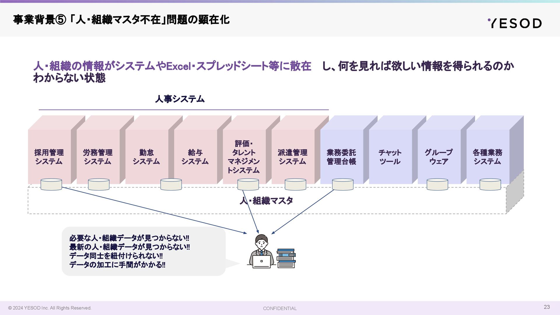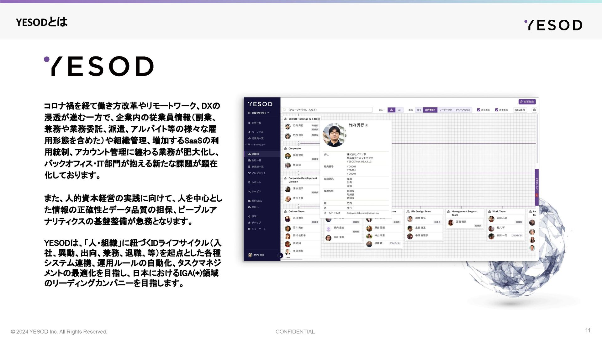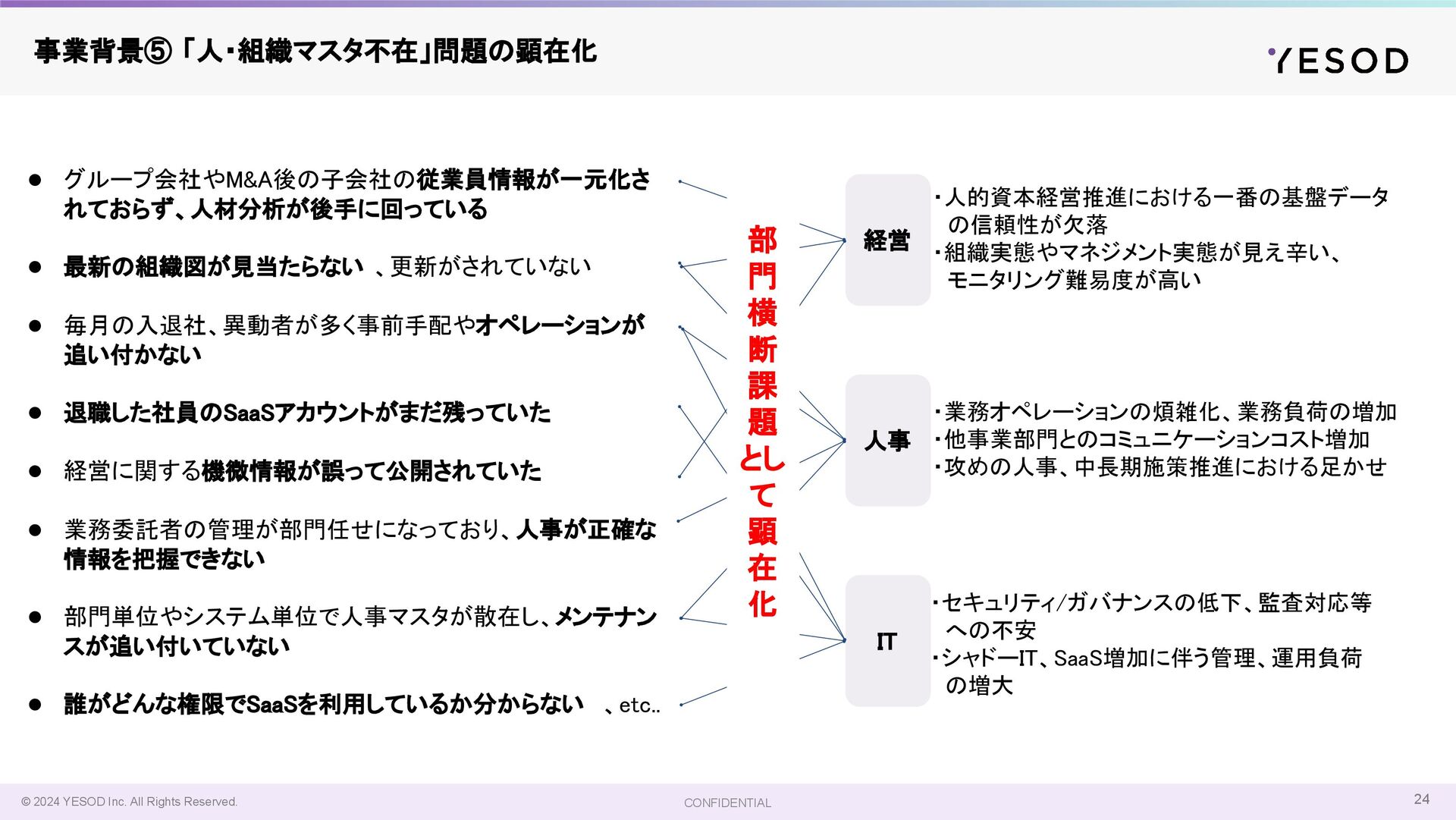 YESOD Inc. All Rights Reserved. CONFIDENTIAL 19 事業背景① SaaS利用の浸透・拡大 「働き方の多様化」、「DX推進」、「クラウドシフト」の流れから業務システムを中心にSaaS化が不可逆な流れとして進んでいる エンタープライスでは1社あたり 数百のSaaS利用 も一般的 ※出典:DNX VenturesがSaaS for SaaS領域に注目する理由 (2024年8月6日 note記事)