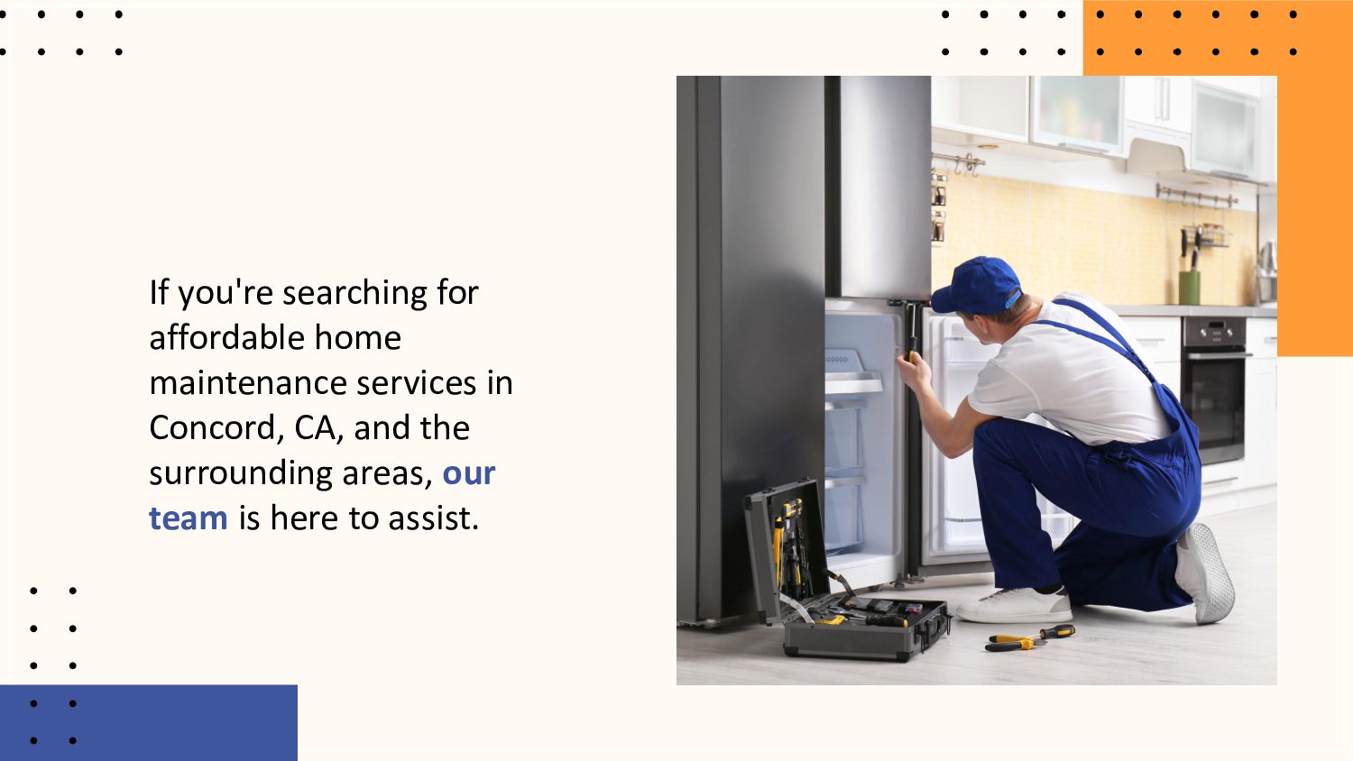 Looking for affordable and reliable home maintenance services in Concord, CA, and nearby areas? Our team is ready to assist with all your interior and exterior home needs. Whether it's routine tasks like gutter cleaning or detailed services such as air and water filter replacement, we have you covered. Our experienced home repair handyman professionals ensure your home stays in top condition year-round. Contact us today to schedule your home maintenance services!