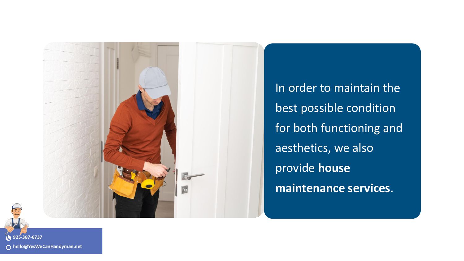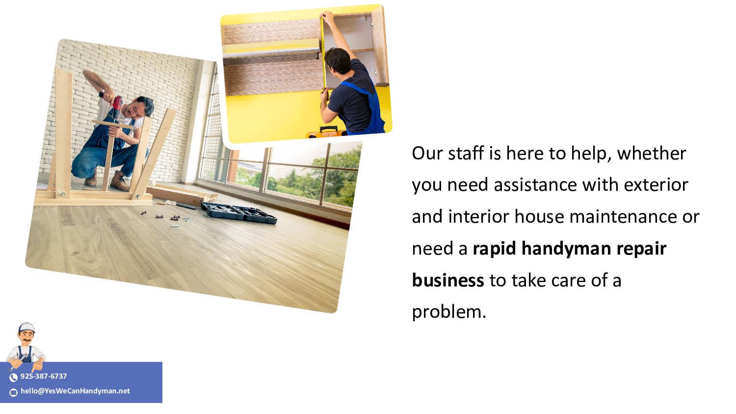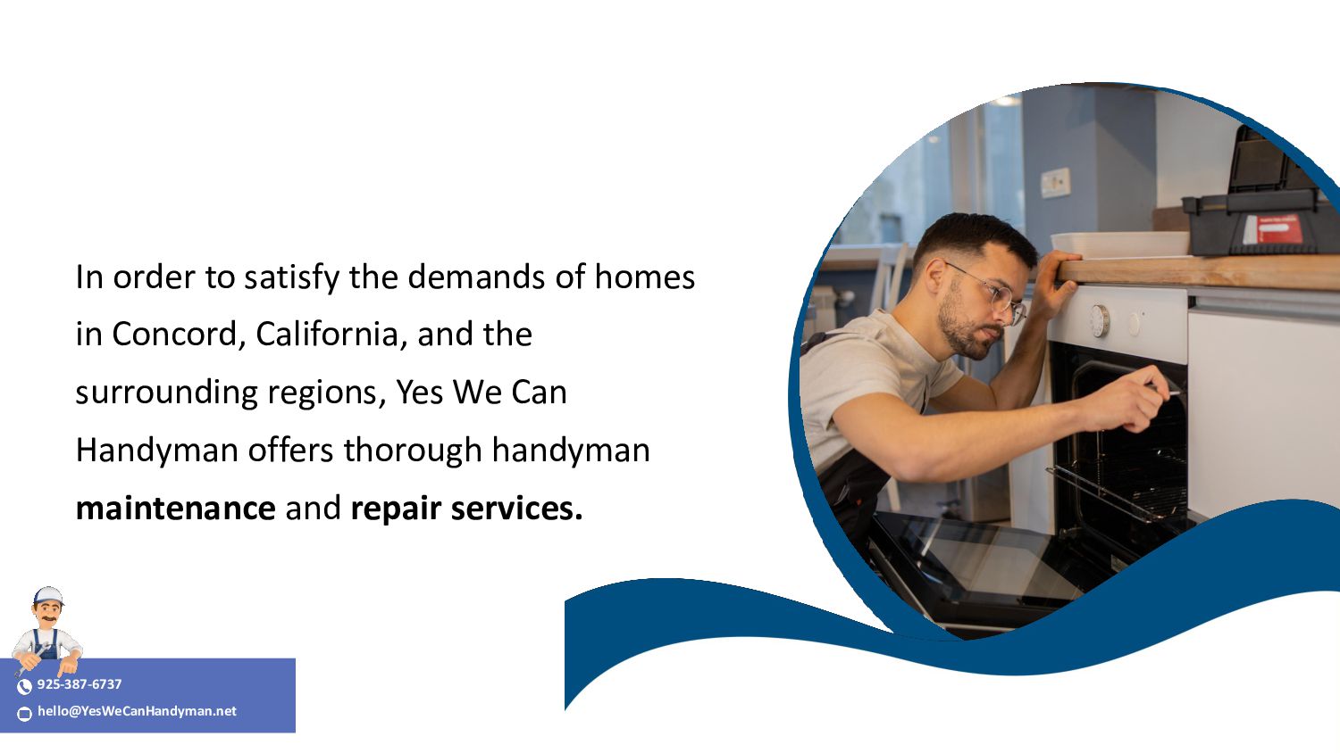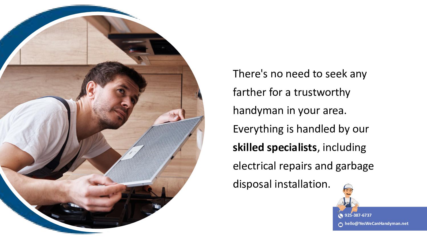 Yes We Can Handyman delivers reliable handyman services to Concord, California, and nearby areas, meeting the needs of homeowners with skilled maintenance and repair solutions. Our expert team is equipped to handle everything from interior and exterior home maintenance to quick repairs for pressing issues. Need electrical repairs or a new garbage disposal installed? We’ve got you covered! With our commitment to quality, we make sure your home stays in top shape both in function and appearance. For trustworthy handyman services in your area, look no further than Yes We Can Handyman!