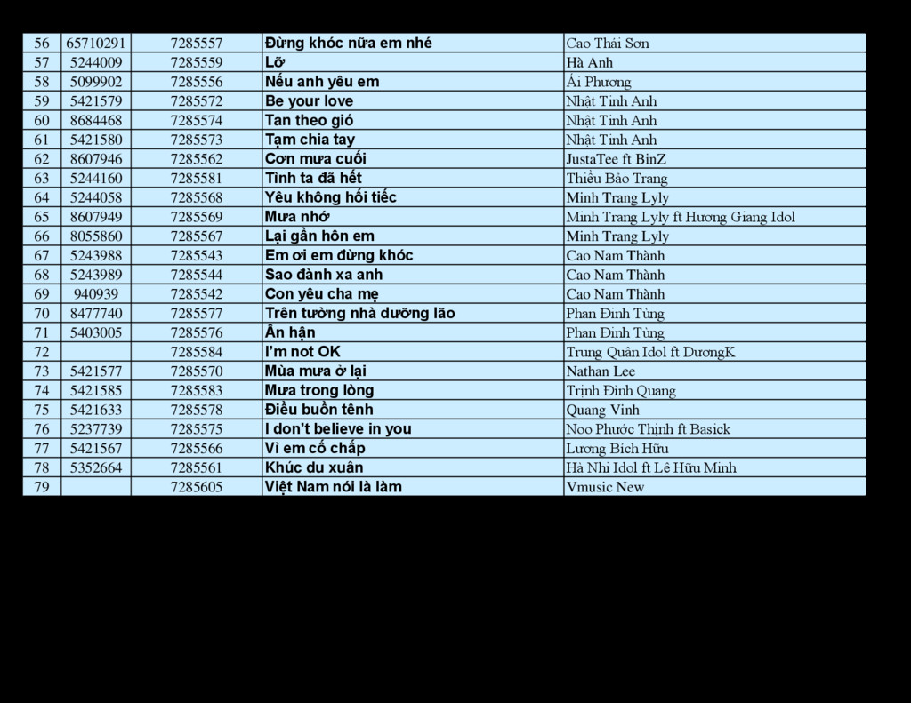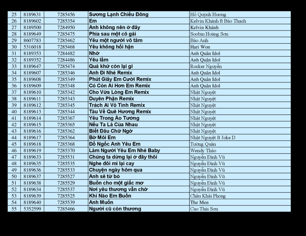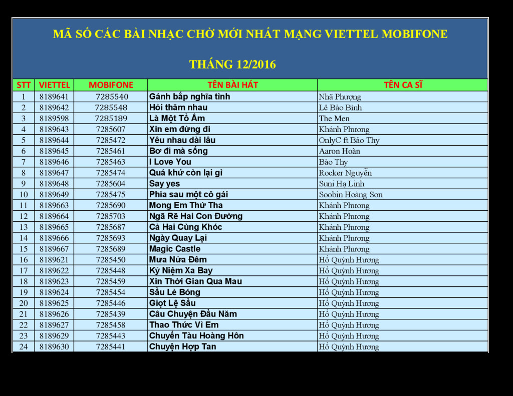 SĨ 1 8189641 7285540 Gánh bắp nghĩa tình Nhã Phượng 2 8189642 7285548 Hỏi thăm nhau Lê Bảo Bình 3 8189598 7285189 Là Một Tổ Ấm The Men 4 8189643 7285607 Xin em đừng đi Khánh Phương 5 8189644 7285472 Yêu nhau dài lâu OnlyC ft Bảo Thy 6 8189645 7285461 Bơ đi mà sống Aaron Hoàn 7 8189646 7285463 I Love You Bảo Thy 8 8189647 7285474 Quá khứ còn lại gì Rocker Nguyễn 9 8189648 7285604 Say yes Suni Hạ Linh 10 8189649 7285475 Phía sau một cô gái Soobin Hoàng Sơn 11 8189663 7285690 Mong Em Thứ Tha Khánh Phương 12 8189664 7285703 Ngã Rẽ Hai Con Đường Khánh Phương 13 8189665 7285687 Cả Hai Cùng Khóc Khánh Phương 14 8189666 7285693 Ngày Quay Lại Khánh Phương 15 8189667 7285689 Magic Castle Khánh Phương 16 8189621 7285450 Mưa Nửa Đêm Hồ Quỳnh Hương 17 8189622 7285448 Kỷ Niệm Xa Bay Hồ Quỳnh Hương 18 8189623 7285459 Xin Thời Gian Qua Mau Hồ Quỳnh Hương 19 8189624 7285454 Sầu Lẻ Bóng Hồ Quỳnh Hương 20 8189625 7285446 Giọt Lệ Sầu Hồ Quỳnh Hương 21 8189626 7285439 Câu Chuyện Đầu Năm Hồ Quỳnh Hương 22 8189627 7285458 Thao Thức Vì Em Hồ Quỳnh Hương 23 8189629 7285443 Chuyến Tàu Hoàng Hôn Hồ Quỳnh Hương 24 8189630 7285441 Chuyện Hợp Tan Hồ Quỳnh Hương MÃ SỐ CÁC BÀI NHẠC CHỜ MỚI NHẤT MẠNG VIETTEL MOBIFONE