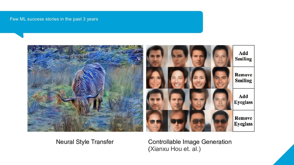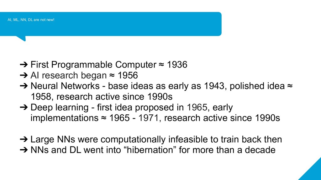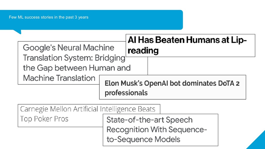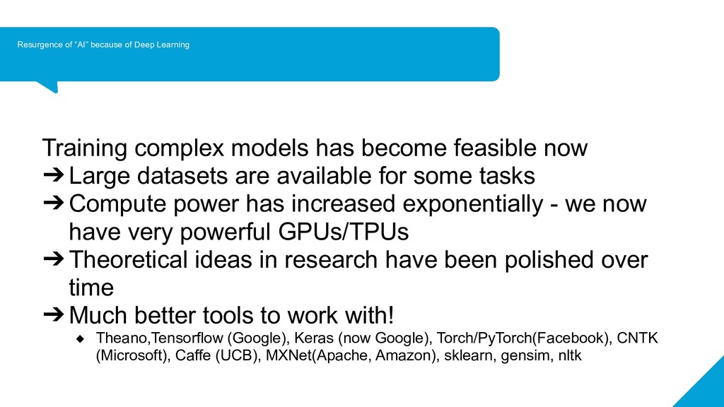 has become feasible now ➔ Large datasets are available for some tasks ➔ Compute power has increased exponentially - we now have very powerful GPUs/TPUs ➔ Theoretical ideas in research have been polished over time ➔ Much better tools to work with! ◆ Theano,Tensorflow (Google), Keras (now Google), Torch/PyTorch(Facebook), CNTK (Microsoft), Caffe (UCB), MXNet(Apache, Amazon), sklearn, gensim, nltk