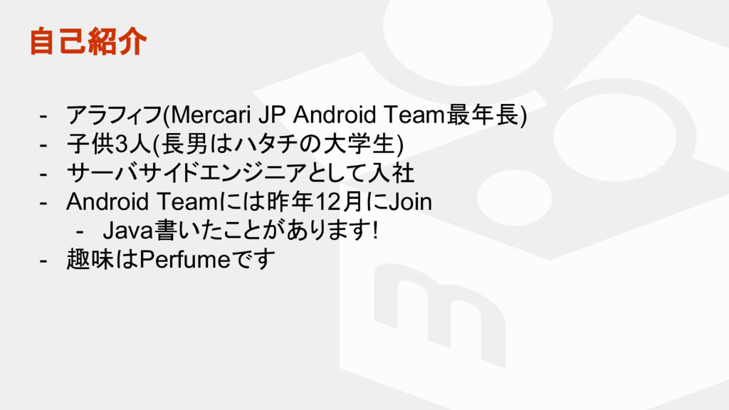 Team最年長) - 子供3人(長男はハタチの大学生) - サーバサイドエンジニアとして入社 - Android Teamには昨年12月にJoin - Java書いたことがあります! - 趣味はPerfumeです