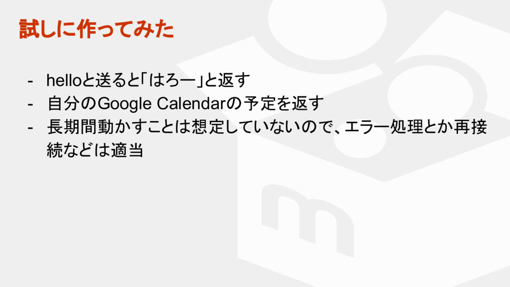 マスター タイトルの書式設定 • マスター テキストの書式設定 試しに作ってみた - helloと送ると「はろー」と返す - 自分のGoogle