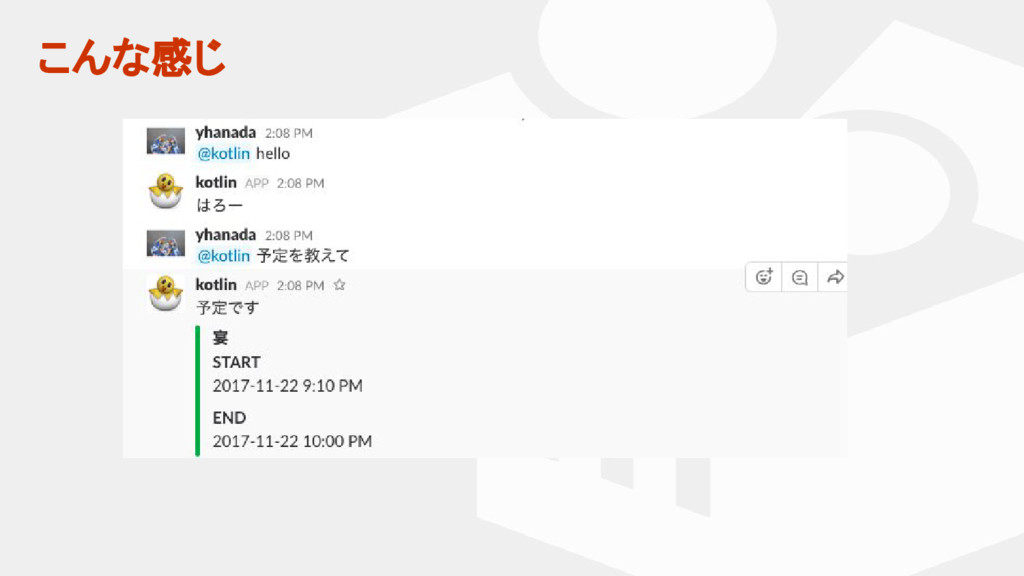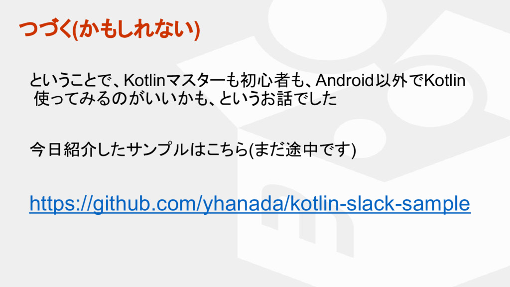 マスター タイトルの書式設定 • マスター テキストの書式設定 つづく(かもしれない) ということで、Kotlinマスターも初心者も、Android以外でKotlin 使ってみるのがいいかも、というお話でした 今日紹介したサンプルはこちら(まだ途中です) https://github.com/yhanada/kotlin-slack-sample