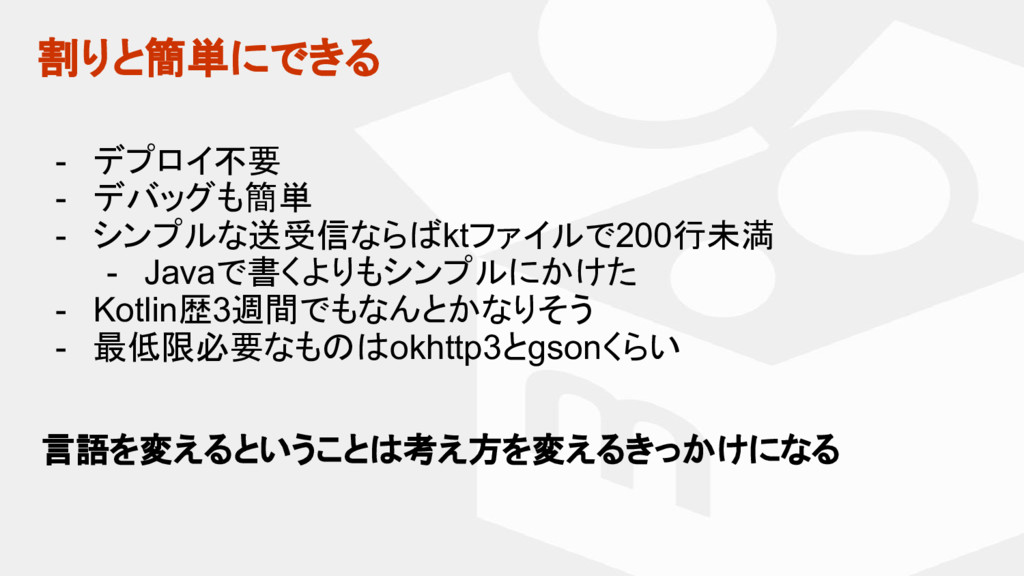 - シンプルな送受信ならばktファイルで200行未満 - Javaで書くよりもシンプルにかけた - Kotlin歴3週間でもなんとかなりそう - 最低限必要なものはokhttp3とgsonくらい 言語を変えるということは考え方を変えるきっかけになる