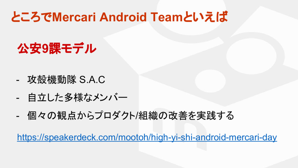 攻殻機動隊 S.A.C - 自立した多様なメンバー - 個々の観点からプロダクト/組織の改善を実践する https://speakerdeck.com/mootoh/high-yi-shi-android-mercari-day