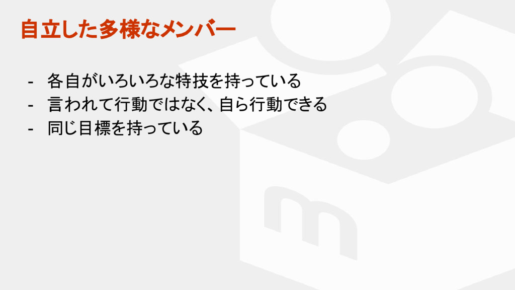 マスター タイトルの書式設定 • マスター テキストの書式設定 自立した多様なメンバー - 各自がいろいろな特技を持っている - 言われて行動ではなく、自ら行動できる