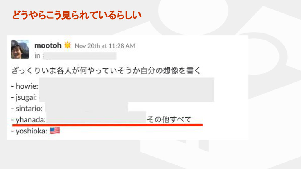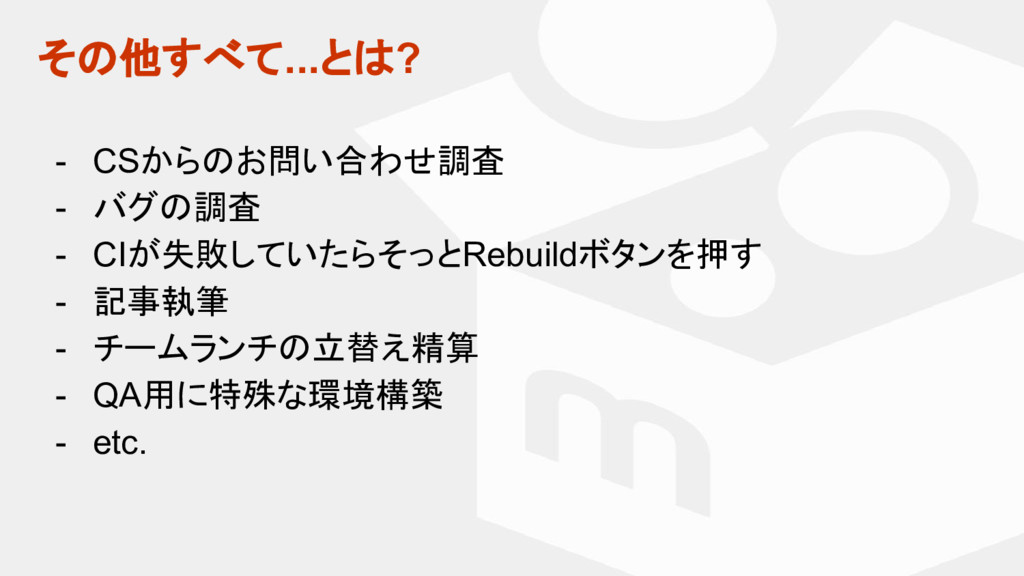 - CIが失敗していたらそっとRebuildボタンを押す - 記事執筆 - チームランチの立替え精算 - QA用に特殊な環境構築 - etc.