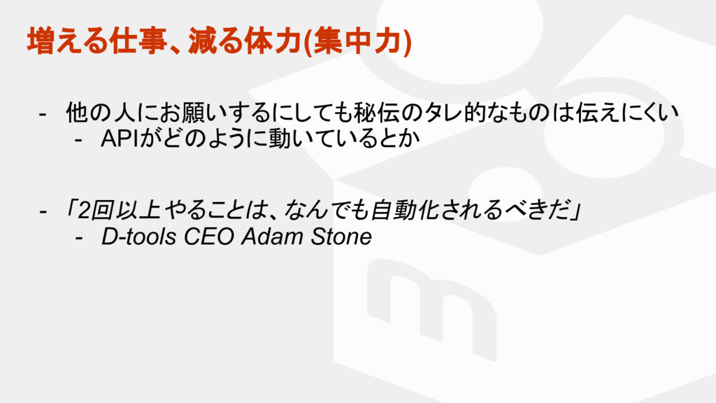 マスター タイトルの書式設定 • マスター テキストの書式設定 増える仕事、減る体力(集中力) - 他の人にお願いするにしても秘伝のタレ的なものは伝えにくい - APIがどのように動いているとか