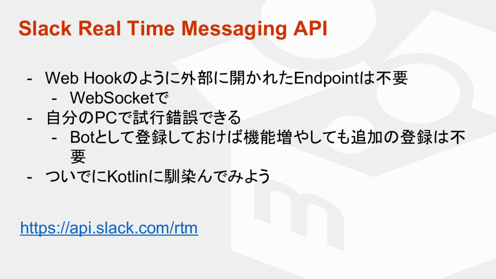 - Web Hookのように外部に開かれたEndpointは不要 - WebSocketで - 自分のPCで試行錯誤できる - Botとして登録しておけば機能増やしても追加の登録は不 要 - ついでにKotlinに馴染んでみよう https://api.slack.com/rtm