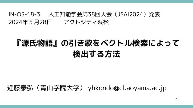 『源氏物語』の引き歌をベクトル検索によって 検出する方法 IN-OS-18-3 人工知能学会第38回大会(JSAI2024)発表 2024年5月28日 アクトシティ浜松 近藤泰弘(青山学院大学)