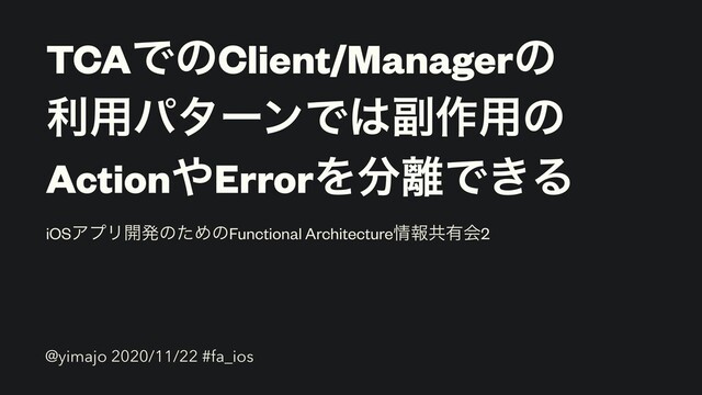 TCAͰͷClient/Managerͷ ར༻ύλʔϯͰ෭࡞༻ͷ ActionErrorΛͰ͖Δ iOSΞϓϦ։ൃͷͨΊͷFunctional Architectureใڞ༗ձ2 @yimajo 2020/11/22 #fa_ios