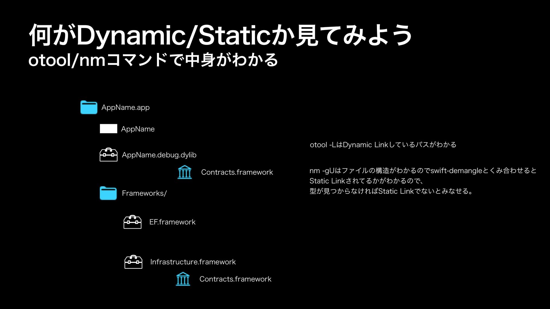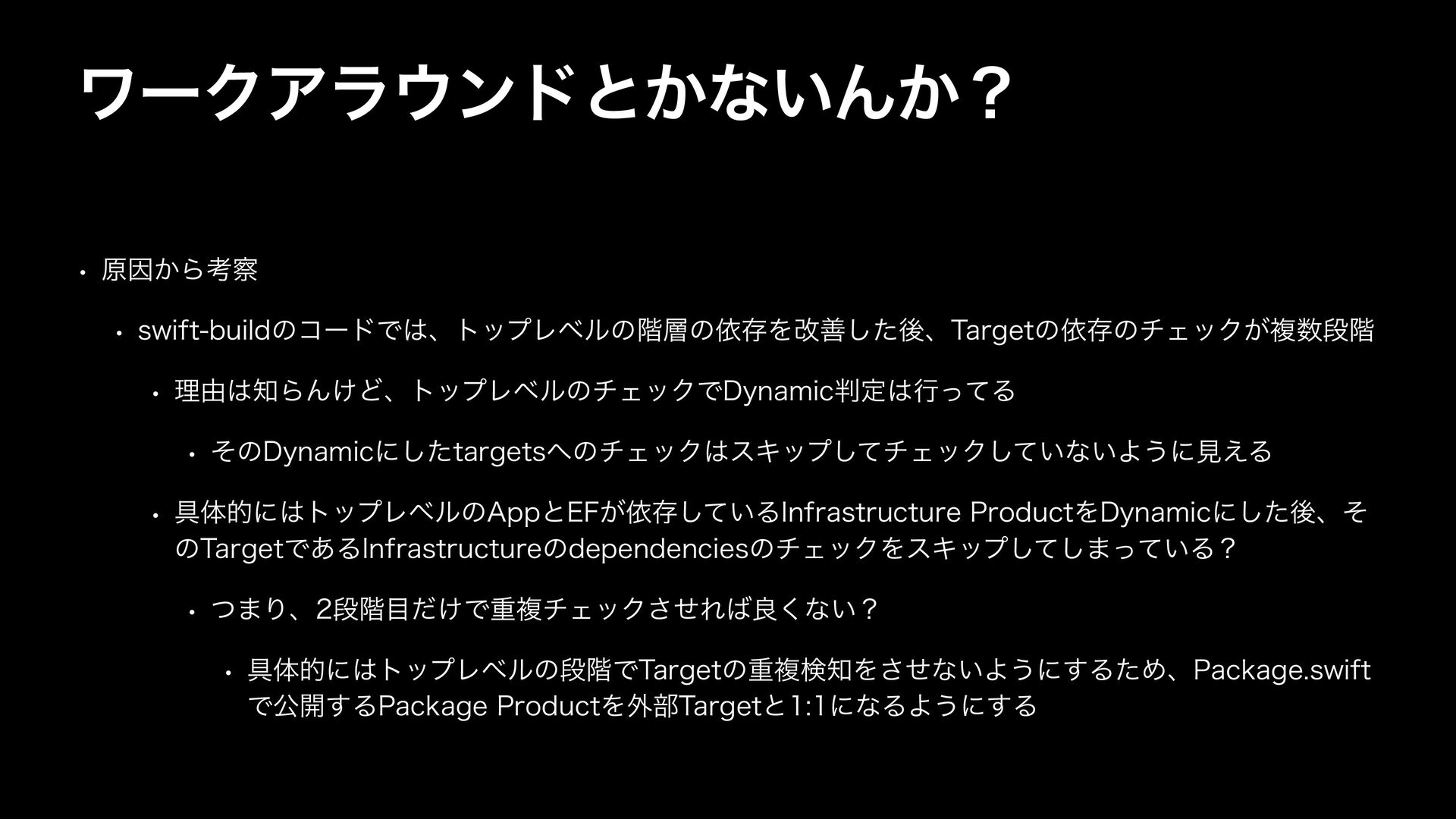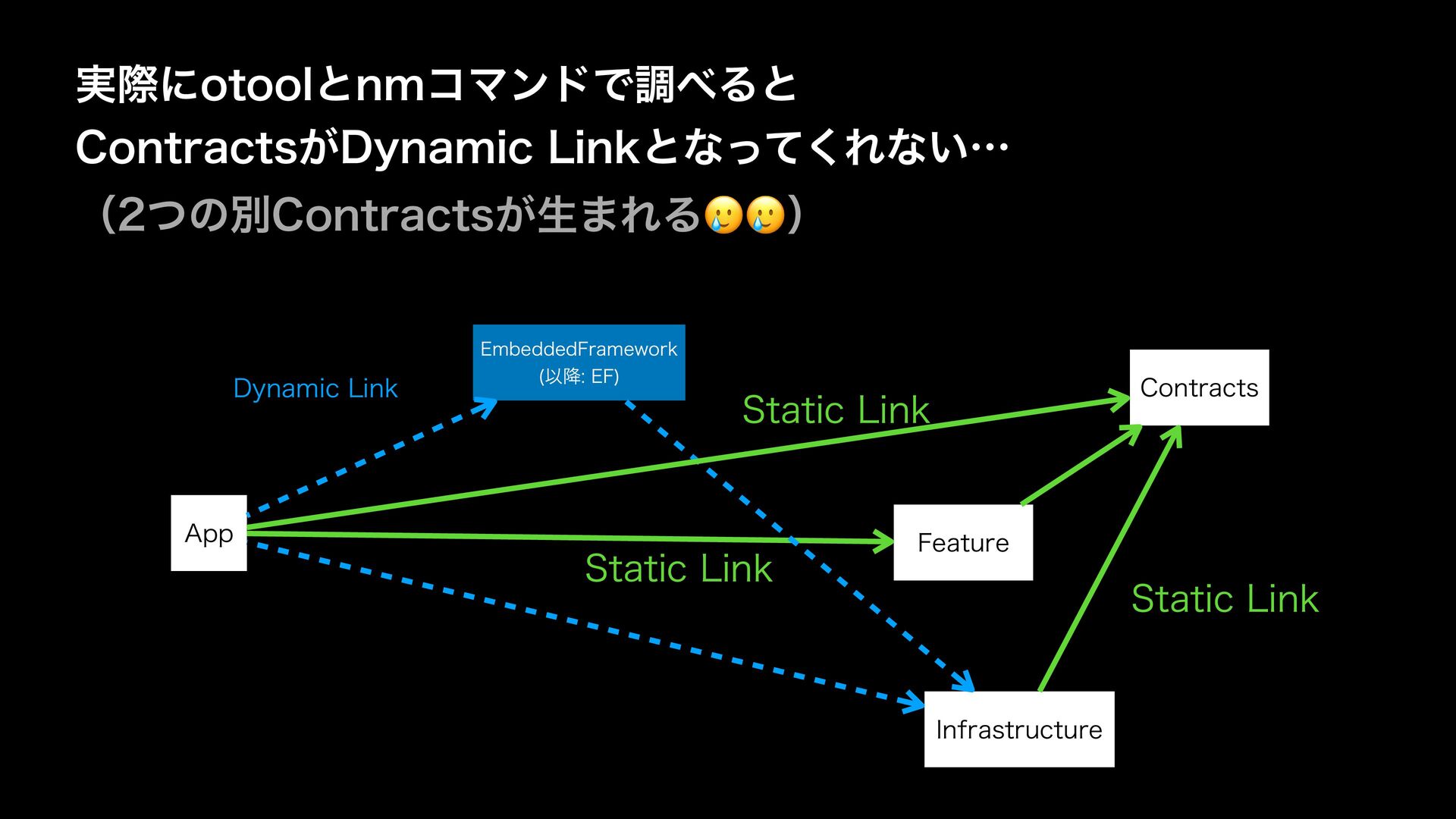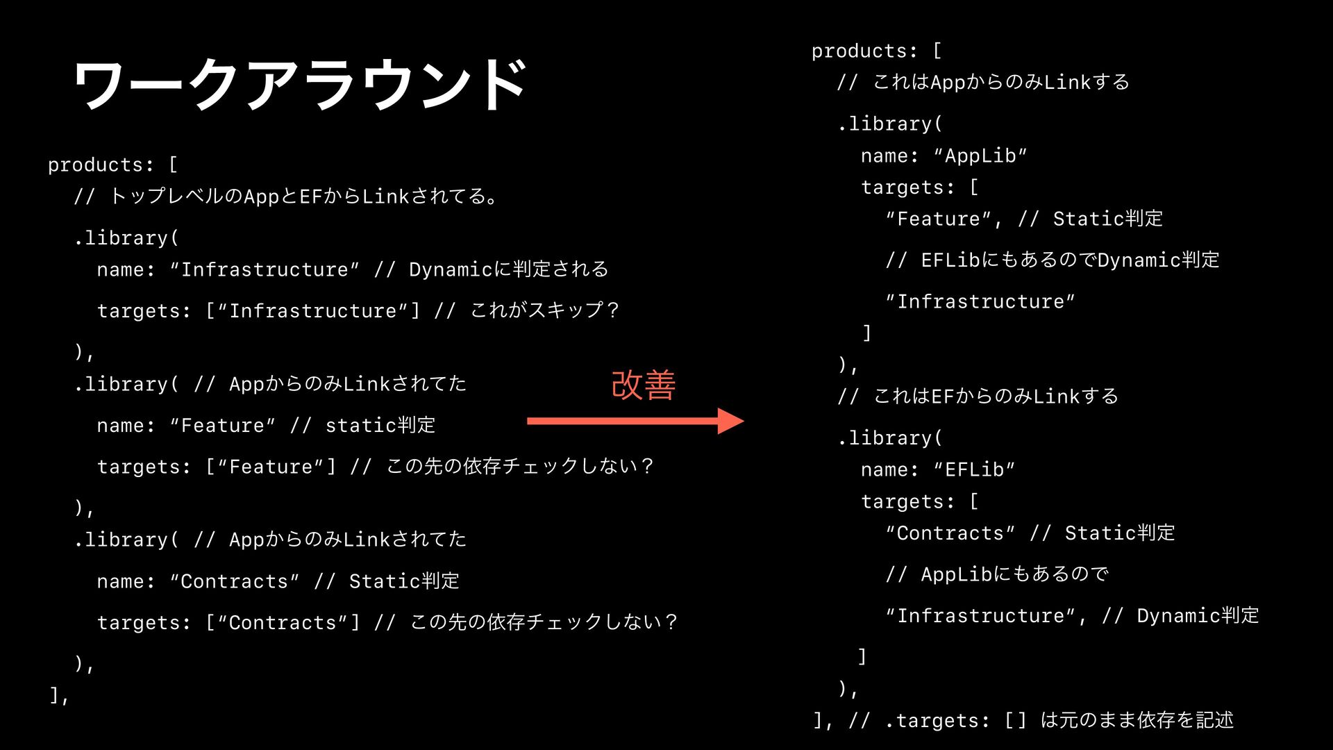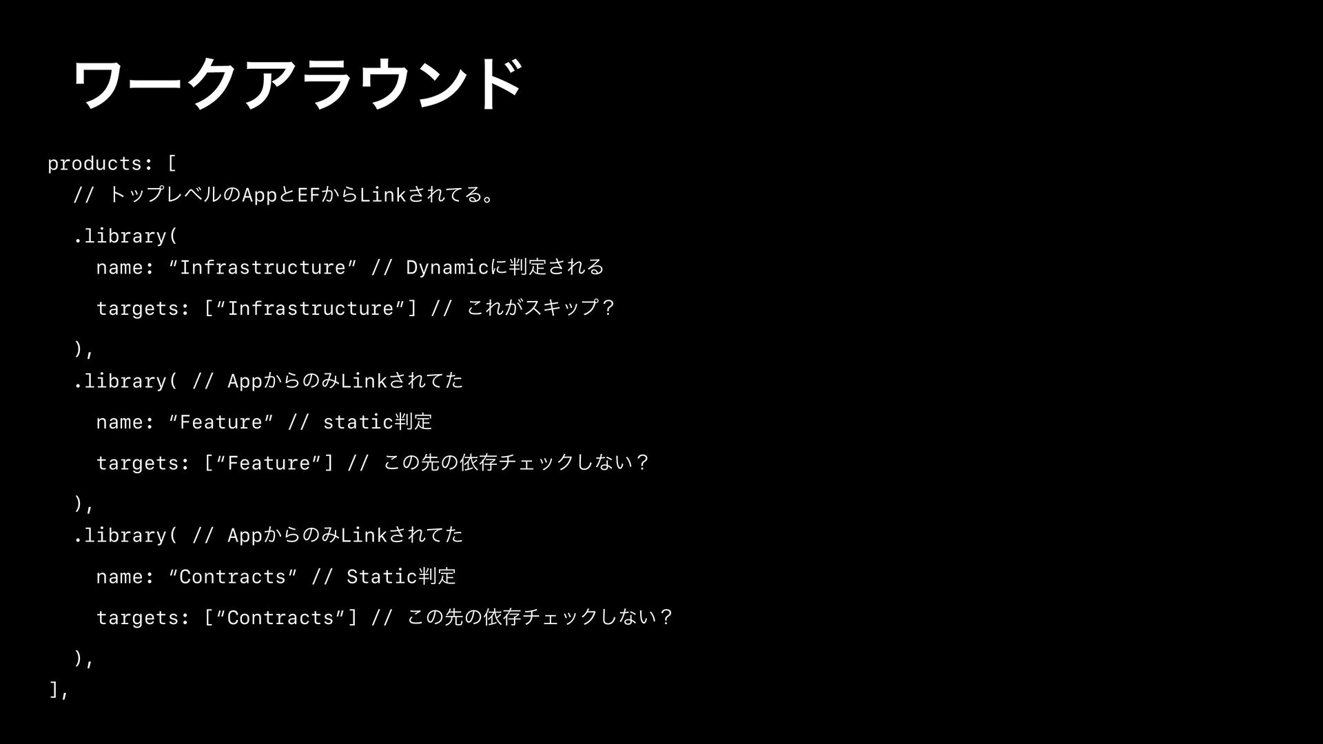 targets: [“Infrastructure”] // ͜Ε͕εΩοϓʁ ), .library( // App͔ΒͷΈLink͞Εͯͨ name: “Feature” // static൑ఆ targets: [“Feature”] // ͜ͷઌͷґଘνΣοΫ͠ͳ͍ʁ ), .library( // App͔ΒͷΈLink͞Εͯͨ name: “Contracts” // Static൑ఆ targets: [“Contracts”] // ͜ͷઌͷґଘνΣοΫ͠ͳ͍ʁ ), ], products: [ // ͜Ε͸App͔ΒͷΈLink͢Δ .library( name: “AppLib” targets: [ “Feature”, // Static൑ఆ // EFLibʹ΋͋ΔͷͰDynamic൑ఆ ”Infrastructure” ] ), // ͜Ε͸EF͔ΒͷΈLink͢Δ .library( name: “EFLib” targets: [ “Contracts” // Static൑ఆ // AppLibʹ΋͋ΔͷͰ “Infrastructure”, // Dynamic൑ఆ ɹ] ), ], // .targets: [] ͸ݩͷ··ґଘΛهड़ վળ