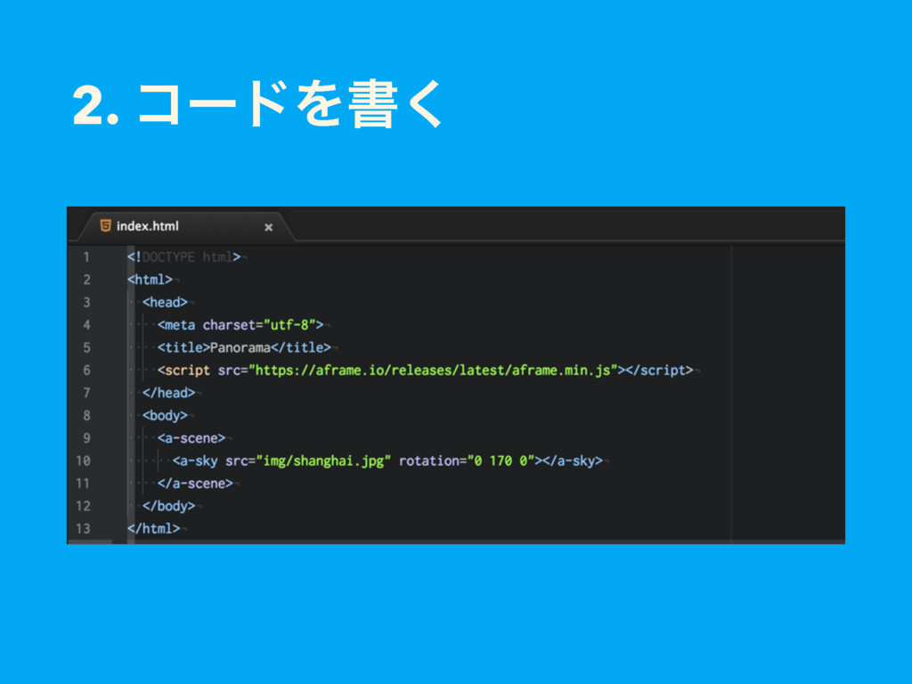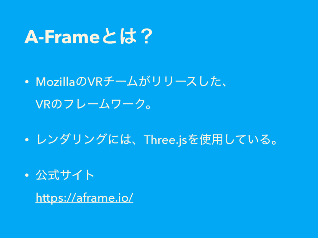 A-Frameͱʁ • MozillaͷVRνʔϜ͕ϦϦʔεͨ͠ɺ VRͷϑϨʔϜϫʔΫɻ • ϨϯμϦϯάʹɺThree.jsΛ༻͍ͯ͠Δɻ • ެࣜαΠτ https://aframe.io/