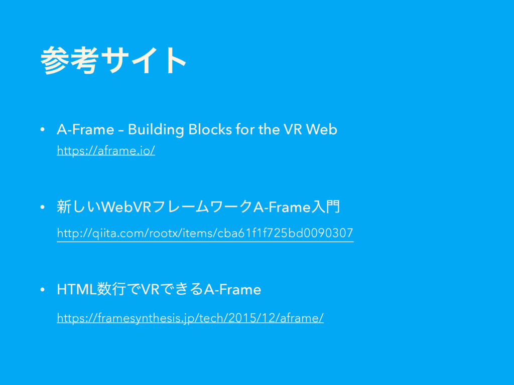 https://aframe.io/ • ৽͍͠WebVRϑϨʔϜϫʔΫA-Frameೖ http://qiita.com/rootx/items/cba61f1f725bd0090307 • HTMLߦͰVRͰ͖ΔA-Frame https://framesynthesis.jp/tech/2015/12/aframe/